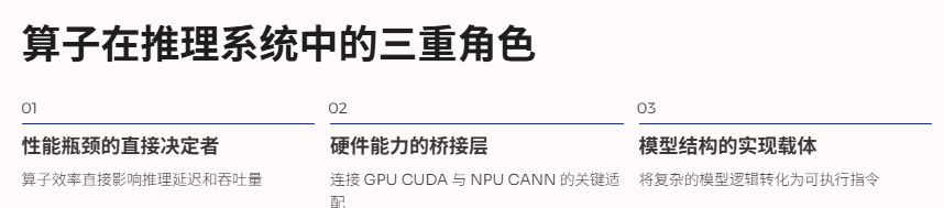 在推理框架(如 PyTorch、vLLM、AscendC Runtime、Megatron、CANN Runtime)之下,真正执行矩阵乘法、attention、softmax、路由、KV 管理等工作的,是算子。算子就像一个个“小型程序单元”,专门负责某一类数学计算或数据处理操作。