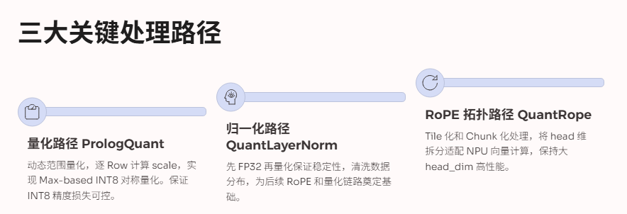 我们可以从最关键的三个路径量化路径(PrologQuant),归一化路径(QuantLayerNorm),RoPE 拓扑路径(QuantRope2D / QuantRope3D)说起。这些路径共同构成 DeepSeek 模型中 Query/Key 输入的主干,是后续 Attention 和专家路由计算的前置条件。