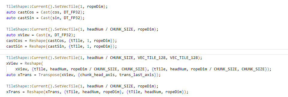 auto xTrans = Transpose(xView, {chunk_head_axis, trans_last_axis});这不是普通的 rope,而是分 head /分 block/分 chunk,在 tile 粒度执行 transpose,再配合 cos/sin 做三维 rope 编码,最后再 reshape 回原来的结构。普通框架中很难做到这么细粒度、可控的 rope 设计,但在 PyPTO 中,只需通过基本操作组合即可。