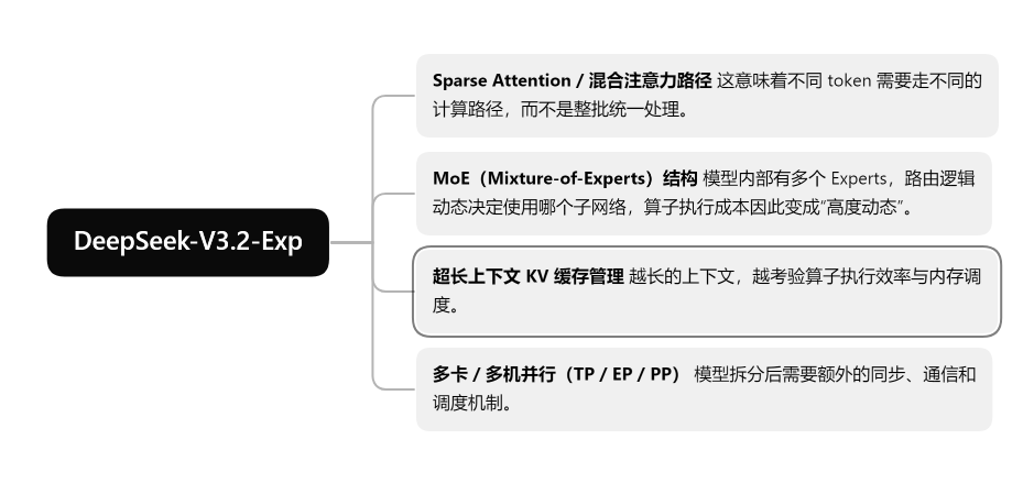 DeepSeek-V3.2-Exp 系列模型本身已经不是“搭个 transformer、堆点层数”这么简单的结构,而是集成了大量面向性能和长上下文的复杂机制,比如:
