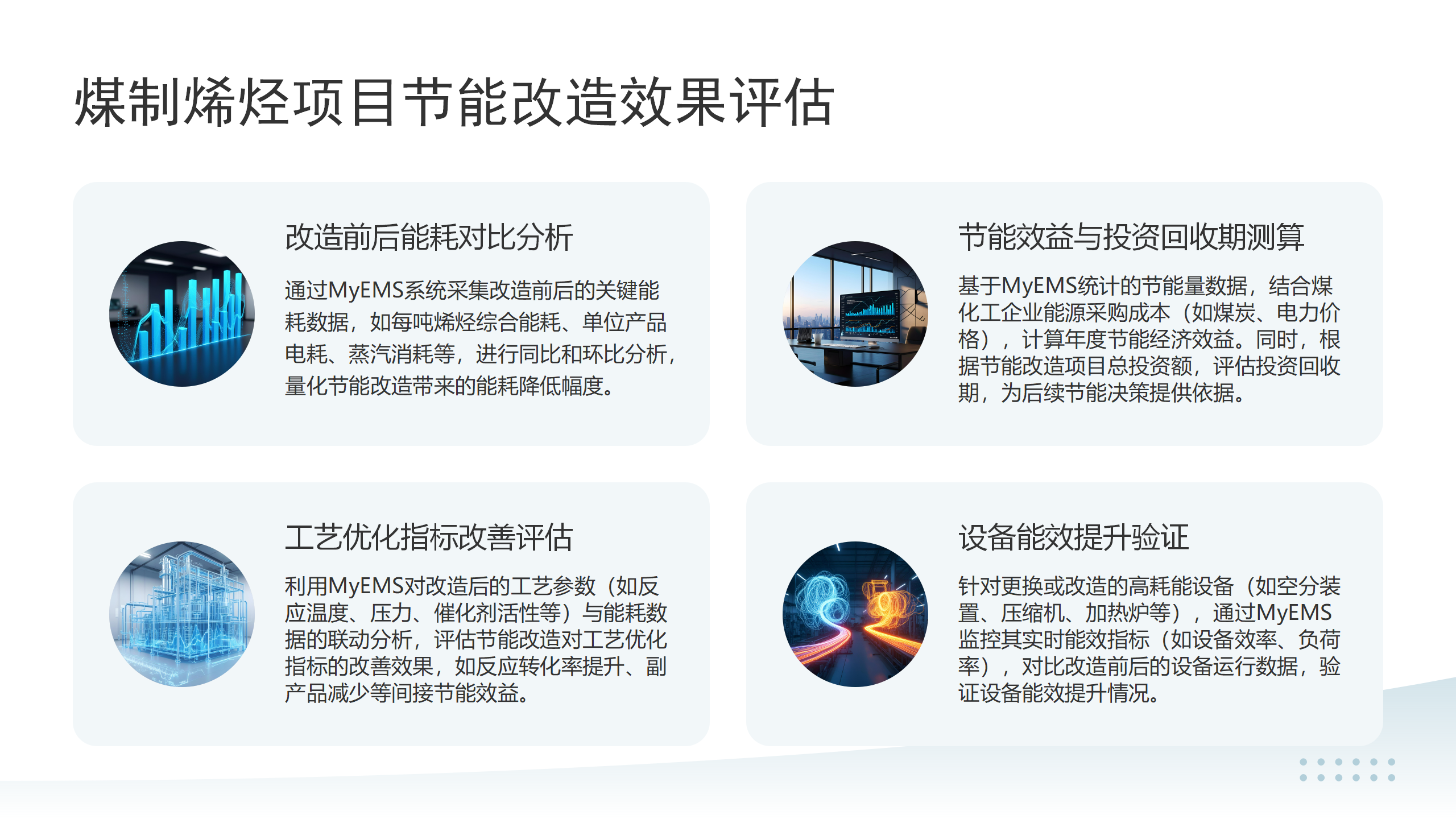 其四是设备能效提升验证,针对更换或改造的高耗能设备,如空分装置、压缩机、加热炉等,通过MyEMS监控其实时能效指标,如设备效率、负荷率,对比改造前后的设备运行数据,验证设备能效提升情况,确保设备改造达到预期目标。综上所述,通过这四个方面的评估,能够全面、准确地衡量煤制烯烃项目节能改造的效果。