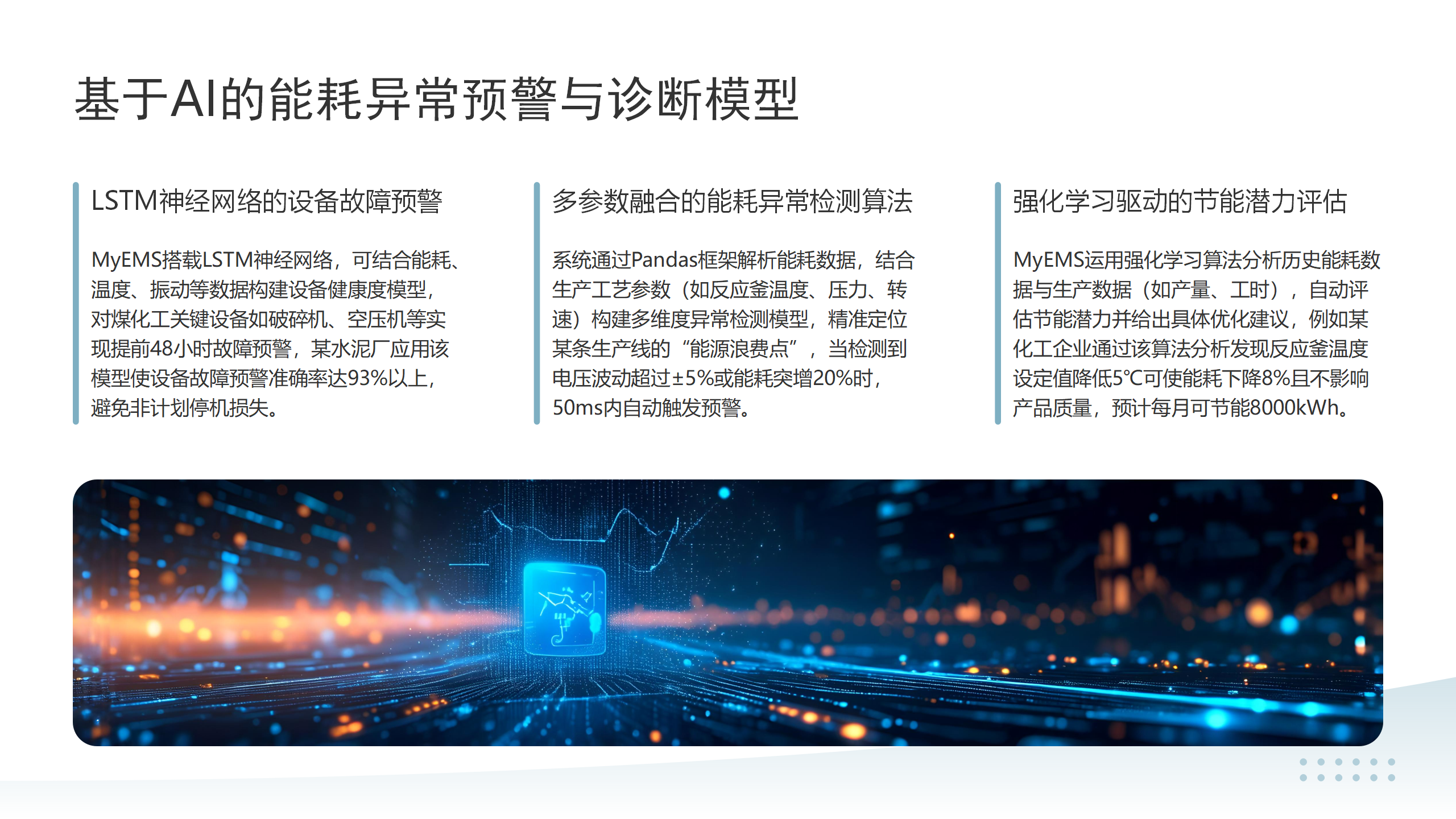多参数融合的能耗异常检测算法,借助Pandas框架解析能耗数据,并融合反应釜温度、压力、转速等生产工艺参数,构建多维度异常检测模型。该模型能够精准定位生产线中的“能源浪费点”,当检测到电压波动超过±5%或能耗突增20%时,可在50ms内自动触发预警,及时发现并解决能耗异常问题。