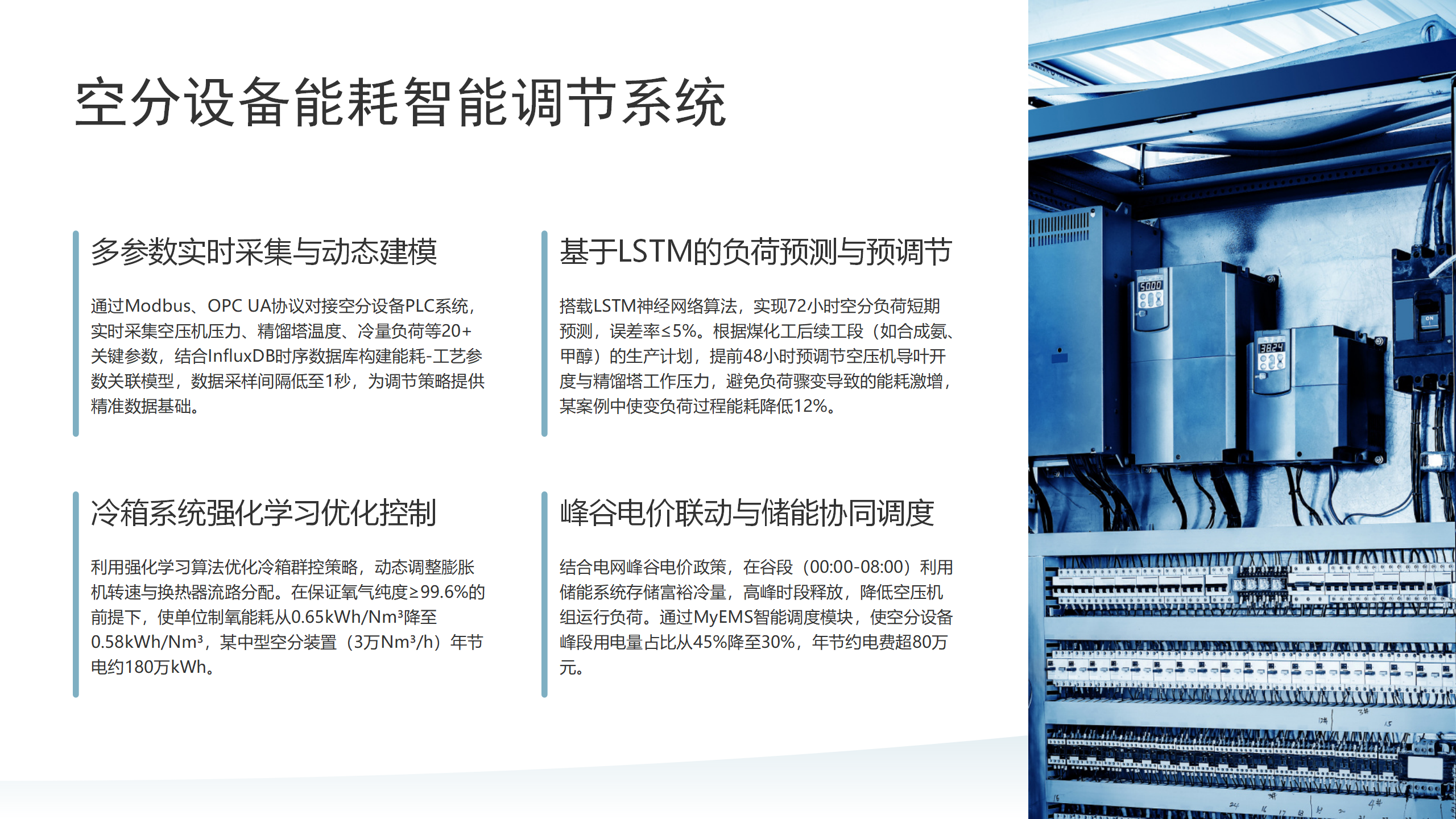 空分设备能耗智能调节系统具备多方面优势,能够有效降低能耗、节约成本。通过Modbus、OPC UA协议对接空分设备PLC系统,可实时采集20多个关键参数,结合InfluxDB时序数据库构建能耗 - 工艺参数关联模型,且数据采样间隔低至1秒,为调节策略提供精准数据基础。