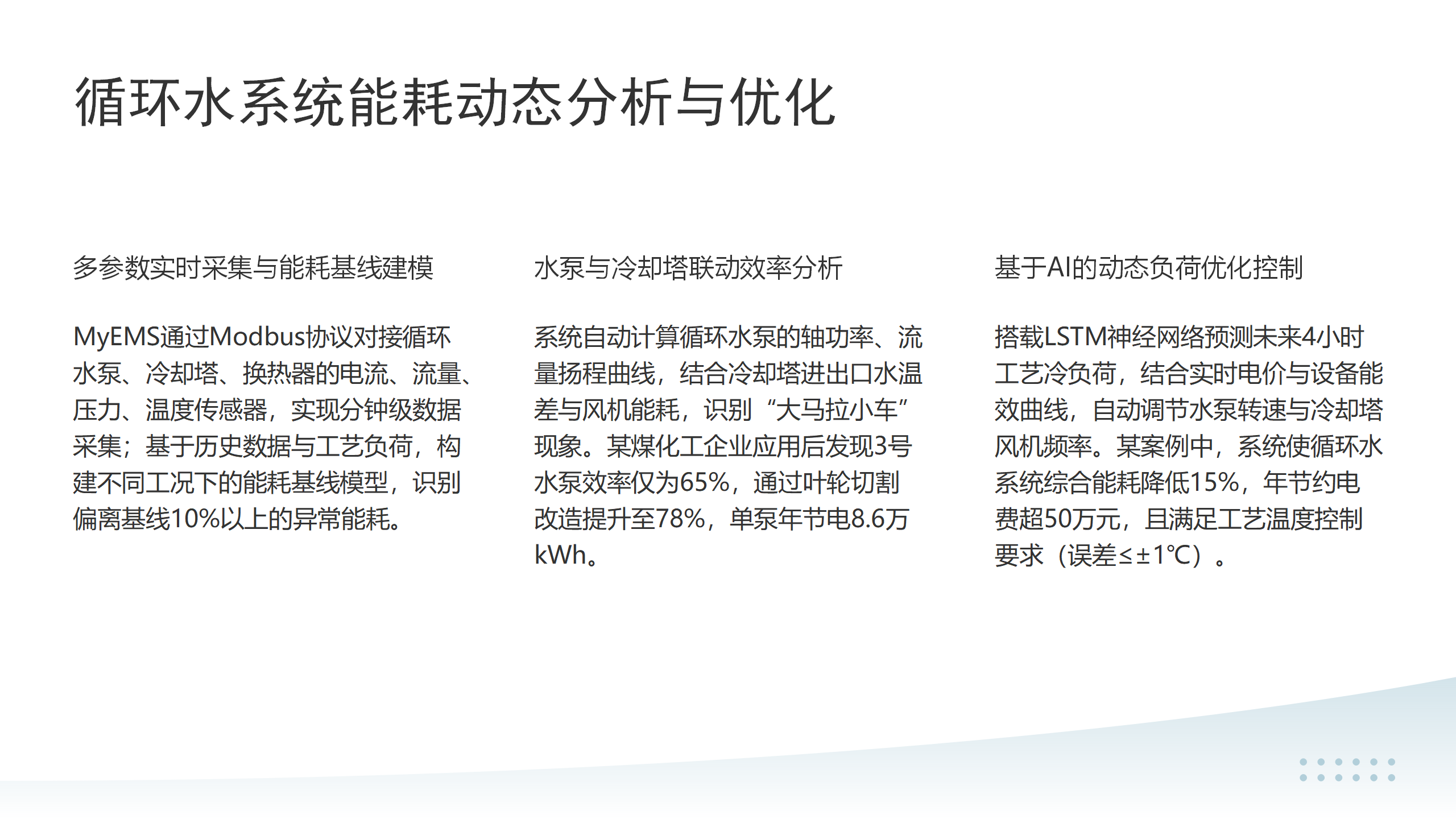 在煤化工生产中,循环水系统的能耗动态分析与优化至关重要,MyEMS在这方面发挥了显著作用。