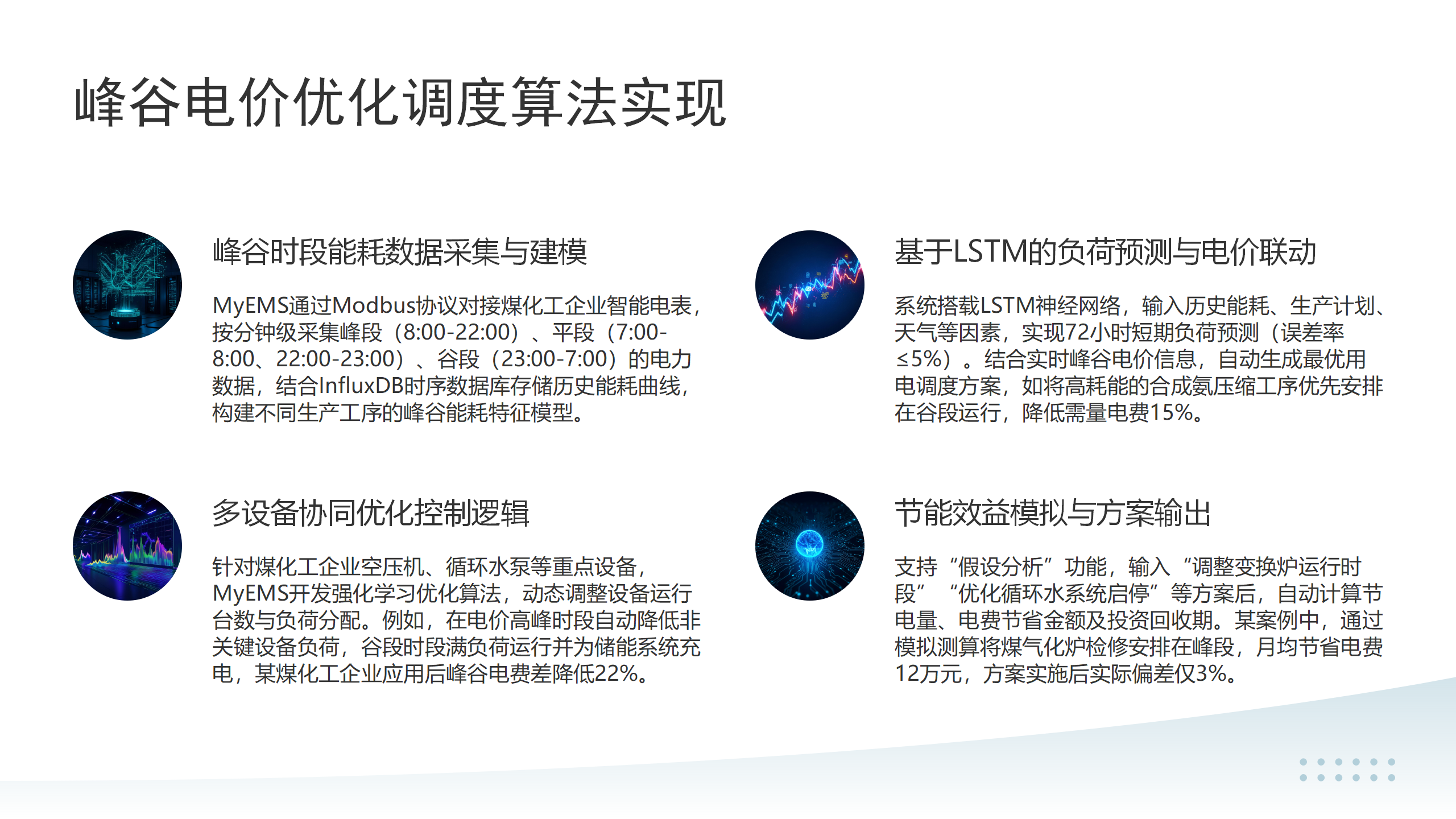 基于LSTM的负荷预测与电价联动功能,系统输入历史能耗、生产计划、天气等因素,实现72小时短期负荷预测,误差率≤5%。结合实时峰谷电价信息,自动生成最优用电调度方案,如将高耗能的合成氨压缩工序安排在谷段运行,降低需量电费15%,有效降低企业用电成本。