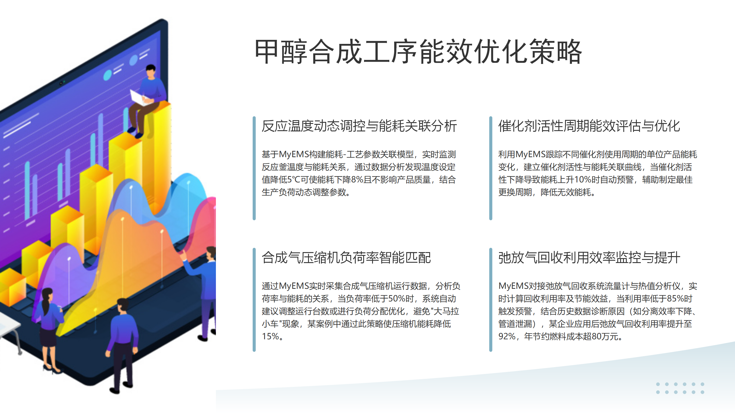 在甲醇合成工序中,MyEMS提供了一系列能效优化策略。首先是反应温度动态调控与能耗关联分析,基于MyEMS构建的能耗 - 工艺参数关联模型,可实时监测反应釜温度与能耗的关系。数据分析表明,温度设定值降低5℃可使能耗下降8%且不影响产品质量,这意味着能在保证产品质量的前提下,结合生产负荷动态调整参数,实现显著的节能效果。