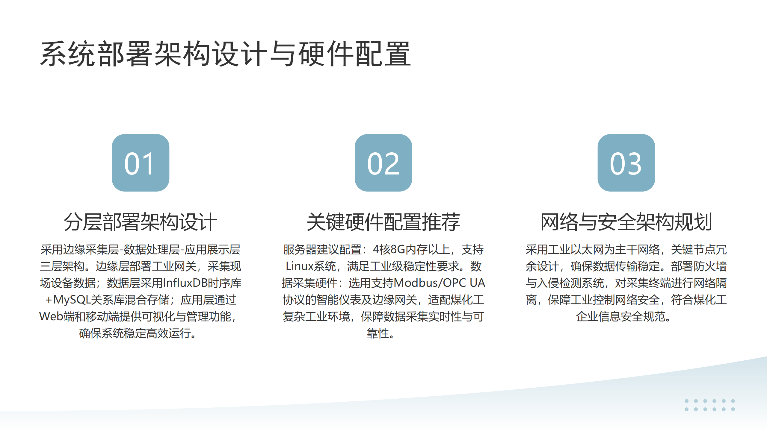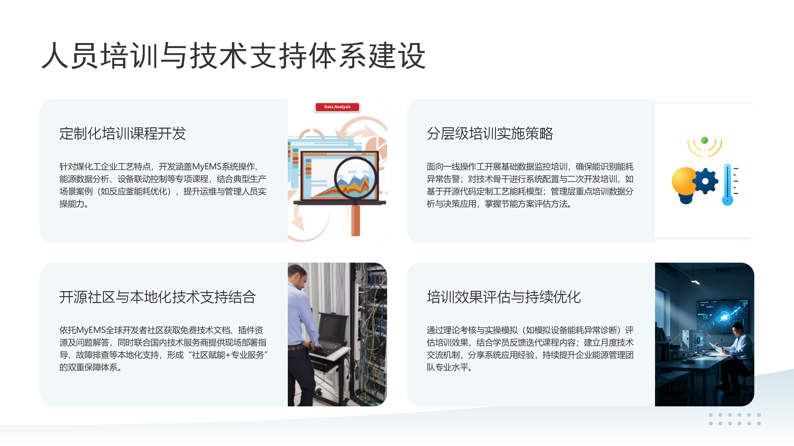 前面我们了解了多个煤化工企业的案例,看到了MyEMS在节能和降碳方面的显著成效。接下来,来到第29页“实施路径与部署策略”。这一页将为我们揭示如何把MyEMS系统顺利应用到企业中。之后还会有系统部署架构、人员培训等内容,值得期待。