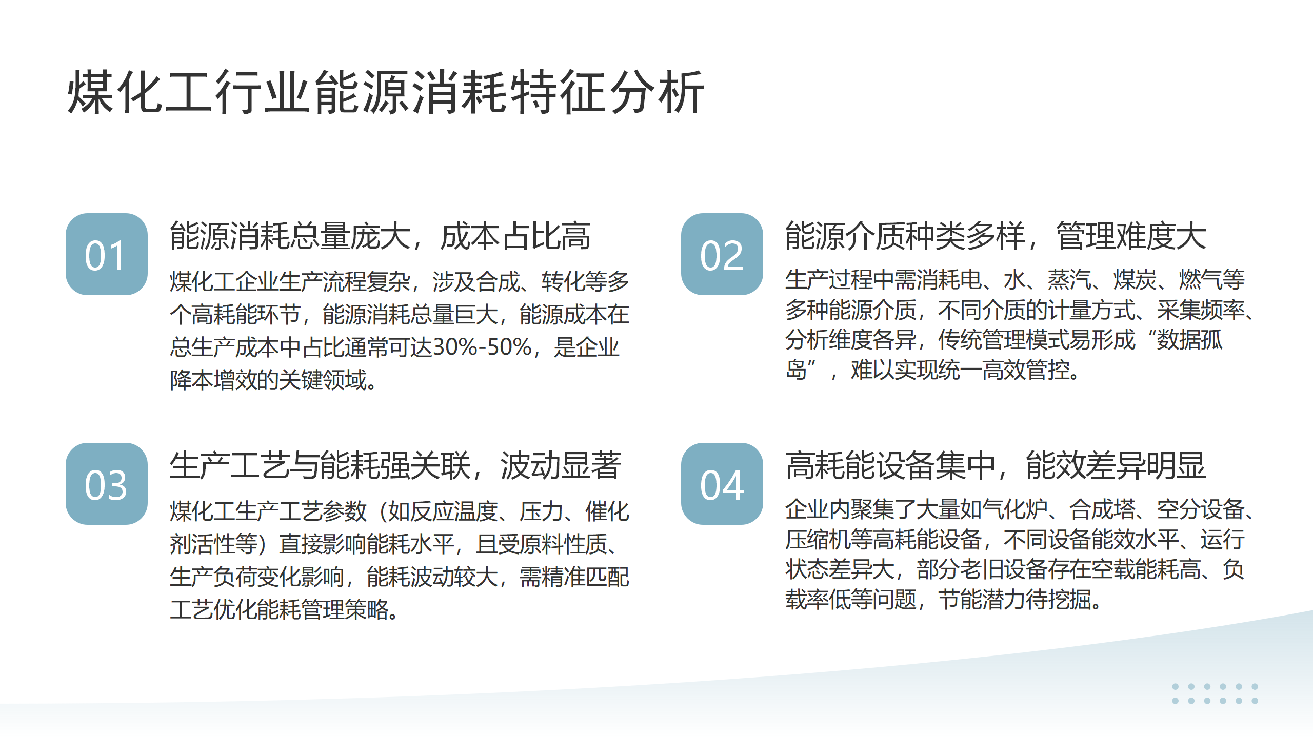 其三,生产工艺与能耗强关联,波动显著。生产工艺参数如反应温度、压力等直接影响能耗水平,且受原料性质和生产负荷变化影响,能耗波动大,需要精准匹配工艺来优化能源管理策略。<output>煤化工行业能源消耗呈现出四大显著特征。其一,能源消耗总量庞大且成本占比高。由于生产流程复杂,涵盖合成、转化等高耗能环节,使得能源消耗总量巨大,能源成本在总生产成本中占比达30%-50%,这无疑是企业降本增效的关键突破点。