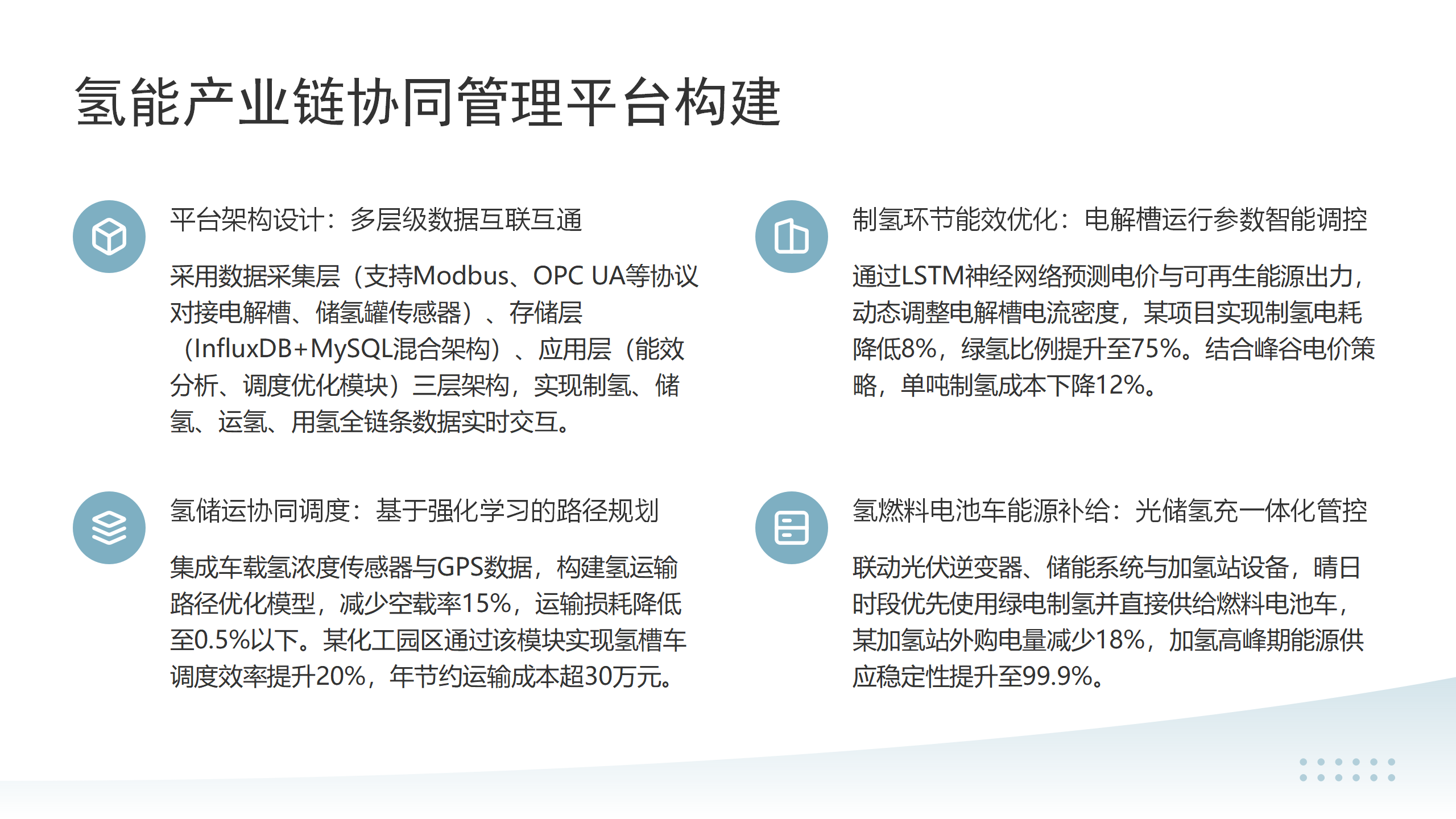 在制氢环节,通过LSTM神经网络预测电价与可再生能源出力,动态调整电解槽电流密度,不仅降低了制氢电耗,还提升了绿氢比例,结合峰谷电价策略,有效降低了单吨制氢成本。这一举措体现了平台在优化能源利用效率方面的显著成效。