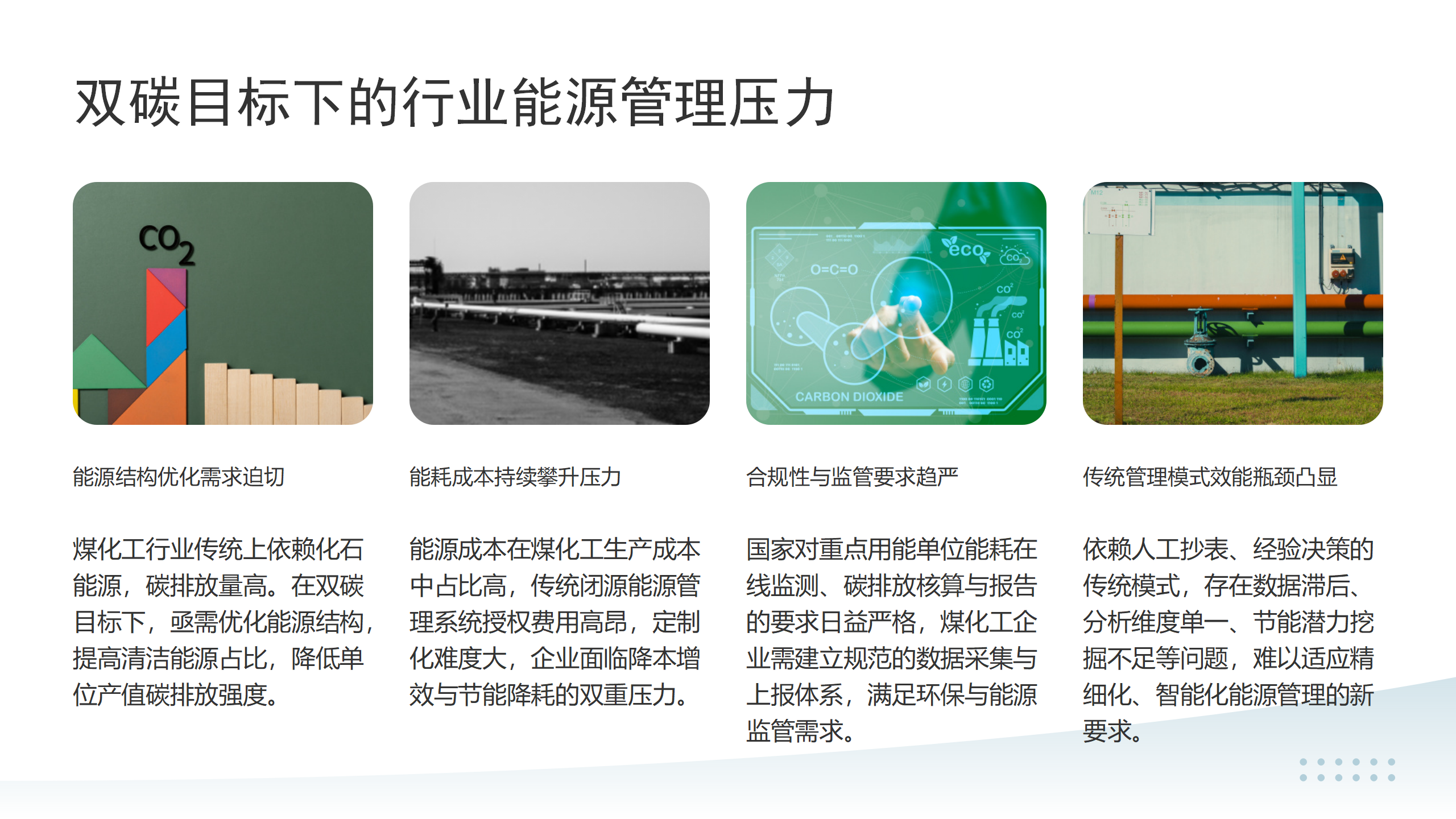 再者,合规性与监管要求越来越严格。国家对重点用能单位的能耗在线监测、碳排放核算与报告要求日益严苛,煤化工企业必须建立规范的数据采集与上报体系,以满足环保与能源监管的需求,否则将面临严厉的处罚。