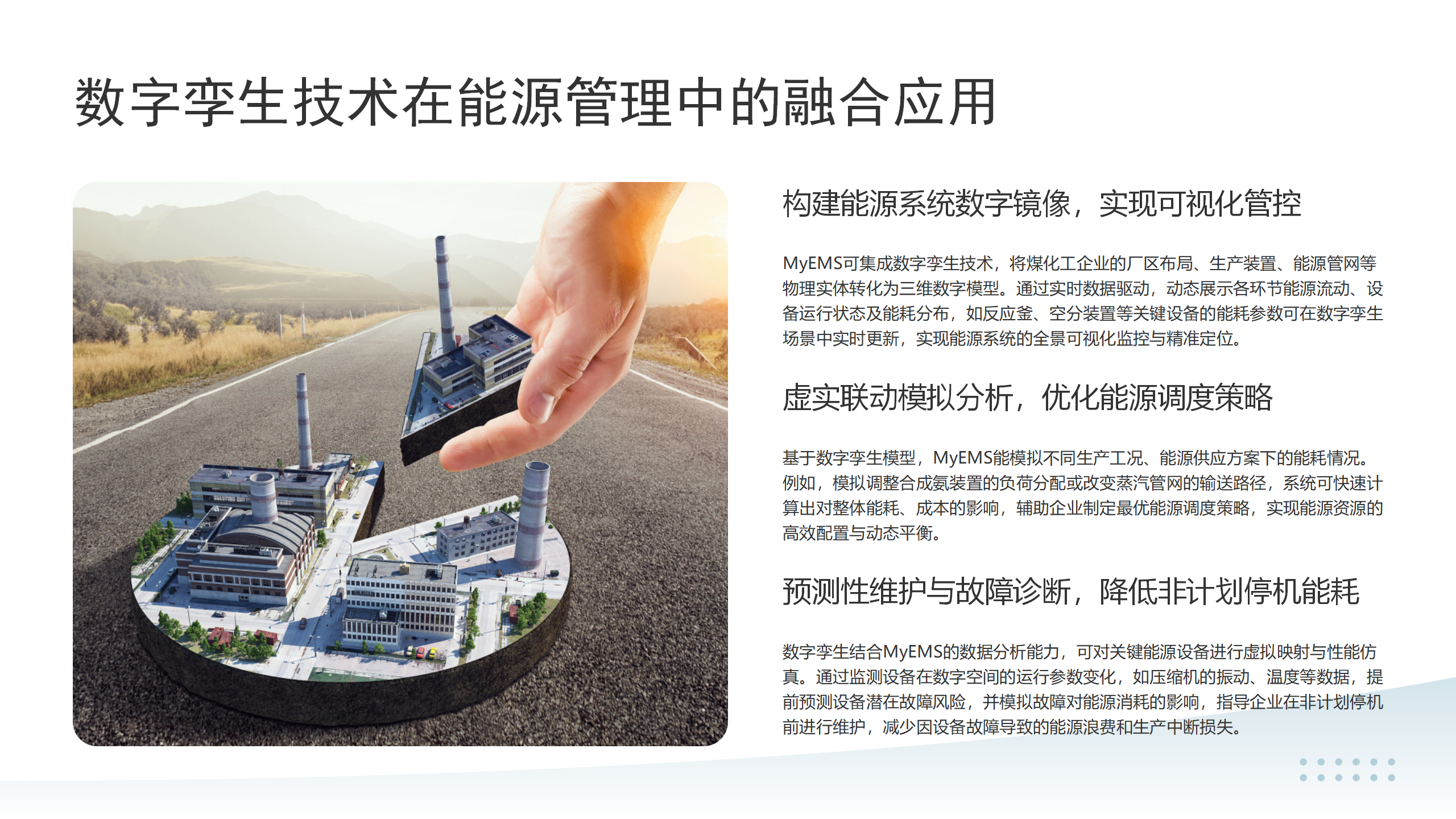 数字孪生技术与MyEMS的融合,为煤化工企业能源管理带来了革新。首先,构建能源系统数字镜像,MyEMS可将企业物理实体转化为三维数字模型。借助实时数据驱动,能源流动、设备运行状态及能耗分布得以动态展示。这不仅实现了能源系统的全景可视化监控,更能精准定位问题,使管理者对能源状况一目了然,为节能决策提供直观依据。