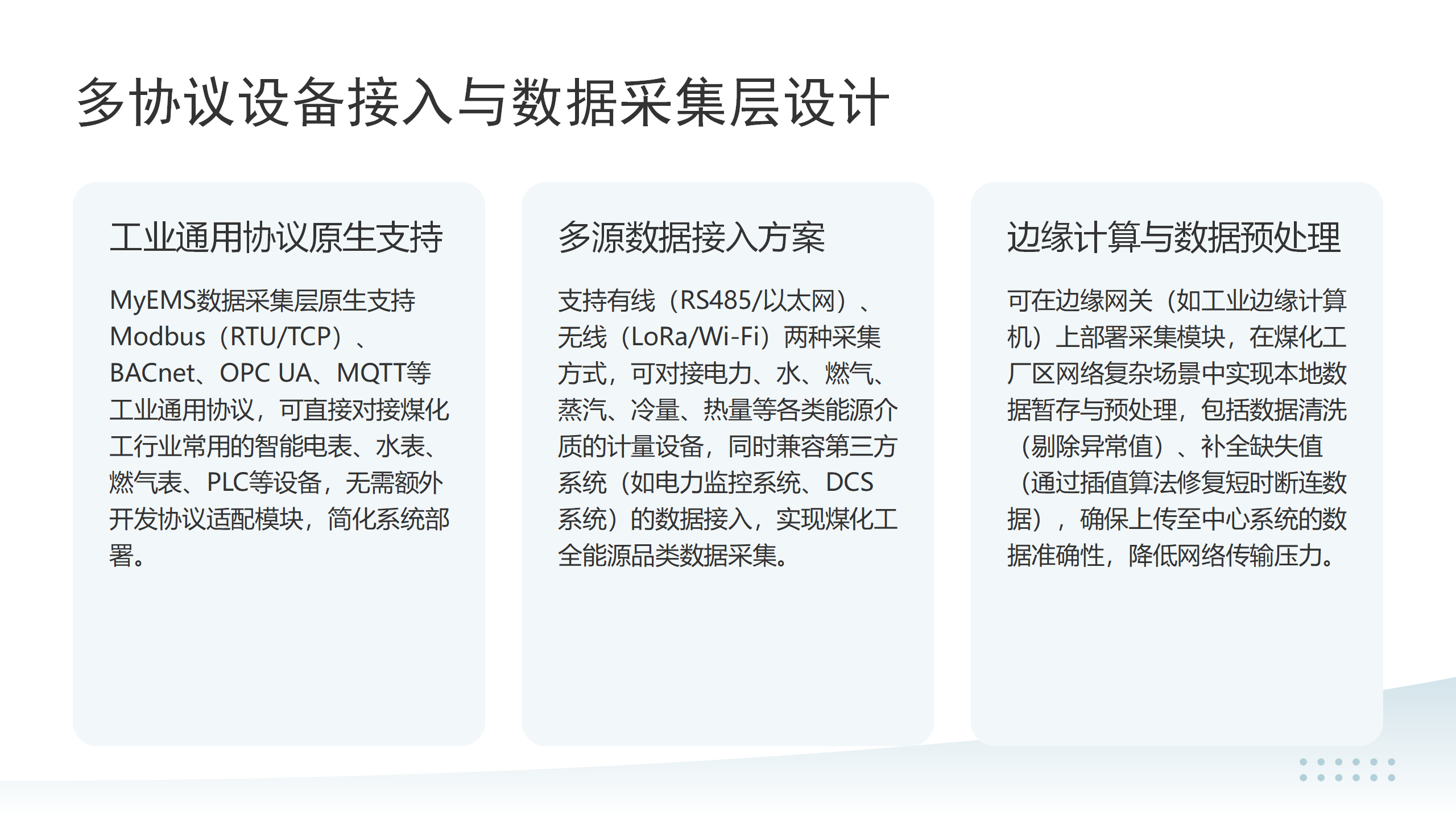 MyEMS的数据采集层具备强大的多协议设备接入与数据采集能力,其设计优势显著。首先,该数据采集层原生支持Modbus(RTU/TCP)、BACnet、OPC UA、MQTT等工业通用协议,这使得它能够直接对接煤化工行业常用的智能电表、水表、燃气表、PLC等设备。无需额外开发协议适配模块,极大地简化了系统部署流程,为企业节省了时间和成本,提高了系统上线的效率。