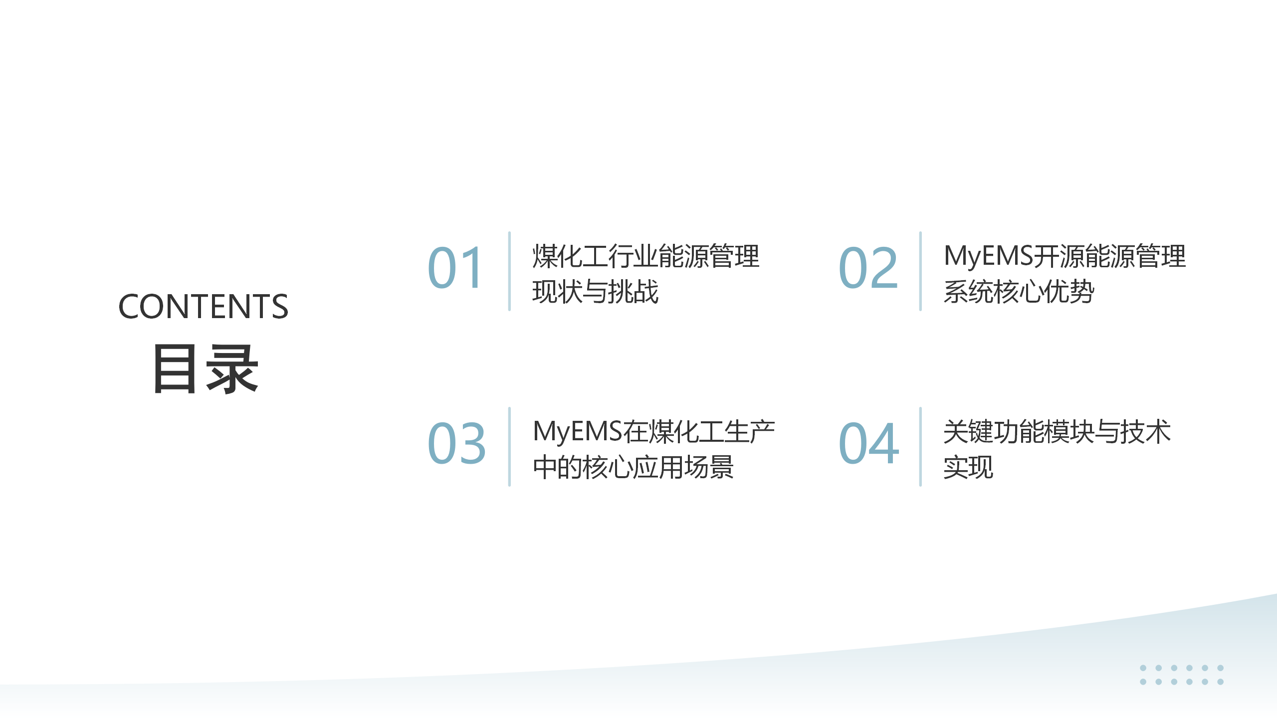 我们已经了解了MyEMS开源能源管理系统的整体情况和目录。接下来,聚焦于煤化工行业能源管理。这一页将深入剖析其现状与挑战,这是我们探讨后续系统优势及应用的基础。了解这些,能更清晰认识系统应用的必要性和价值。