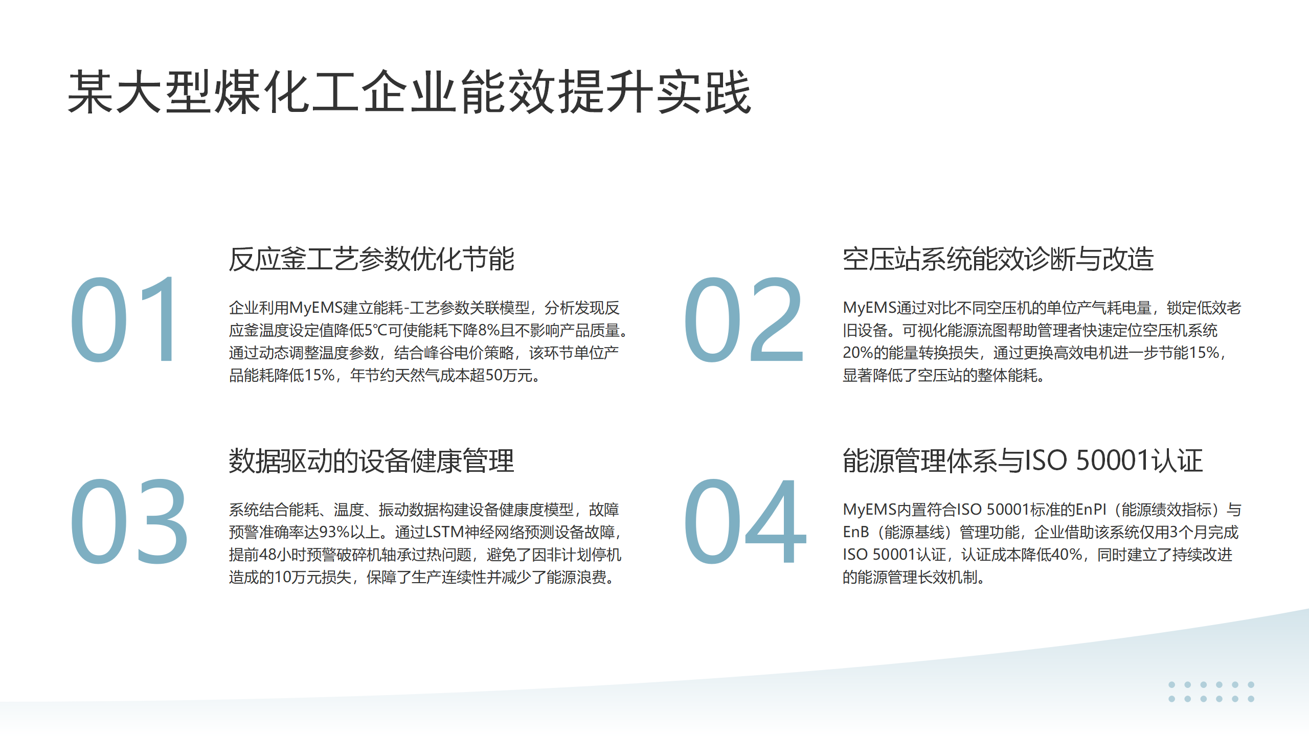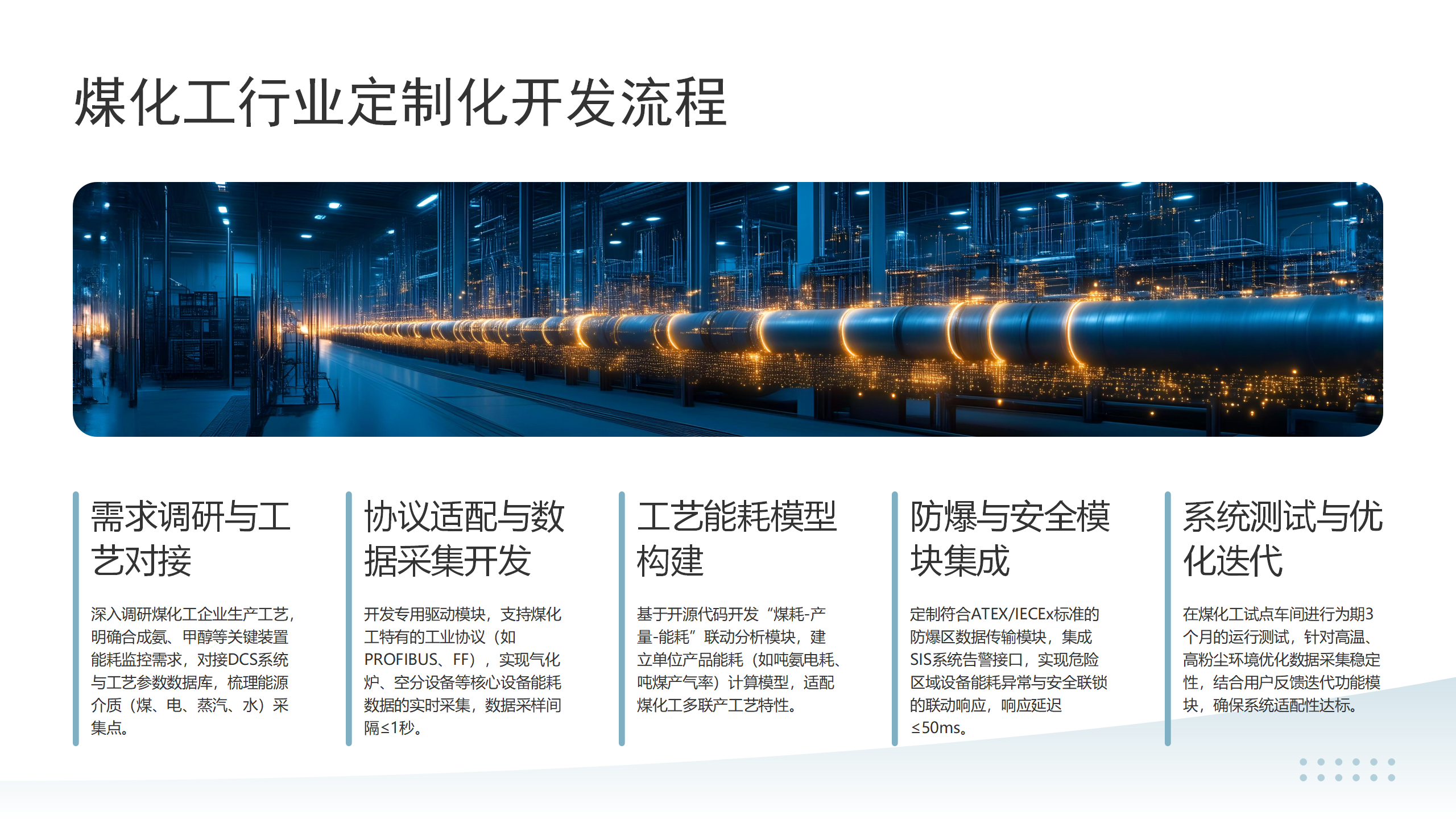 其四,高耗能设备集中且能效差异明显。企业内聚集大量高耗能设备,不同设备的能效水平和运行状态差异大,部分老旧设备存在空载能耗高、负载率低等问题,节能潜力亟待挖掘。这四大特征充分表明,煤化工行业在能源管理方面面临着诸多挑战,需要寻求创新的解决方案。