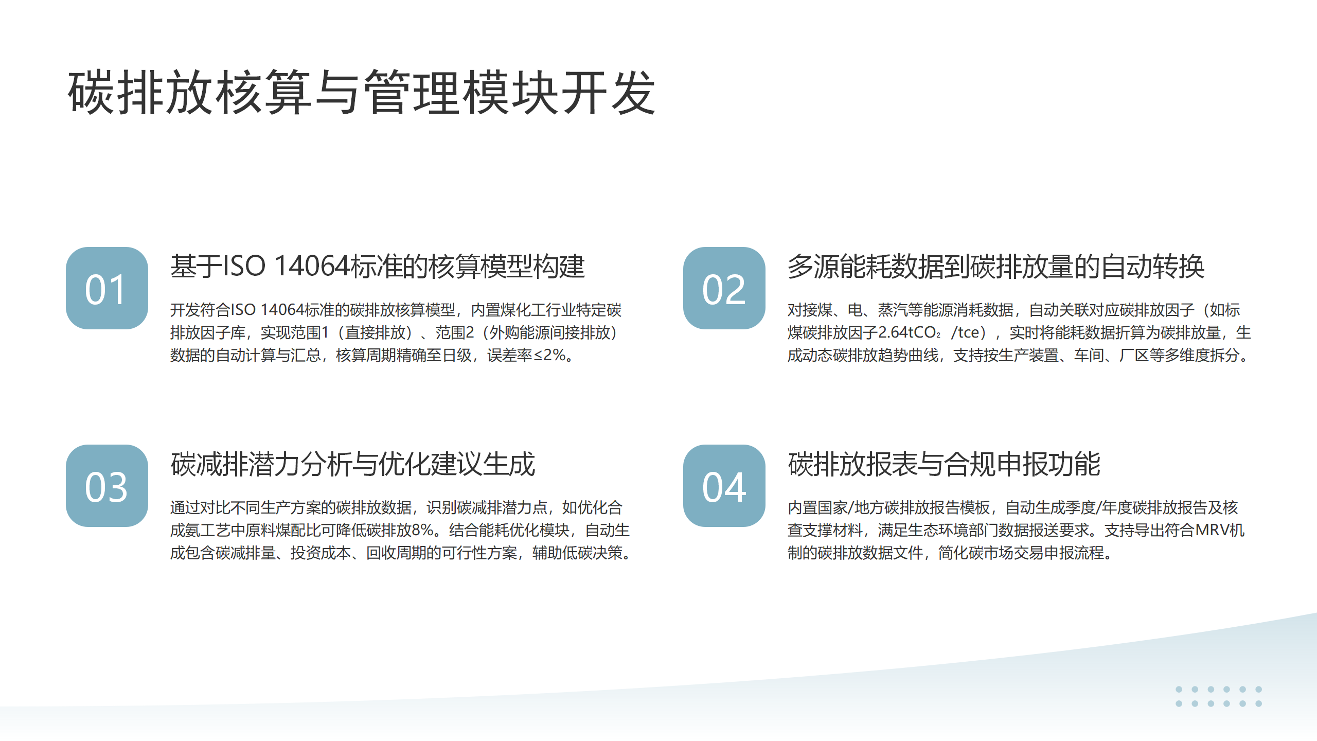 碳排放核算与管理模块开发在当下的煤化工行业中具有重要意义。首先,基于ISO 14064标准构建核算模型,内置特定碳排放因子库,可自动计算并汇总范围1和范围2的数据,核算周期精确至日级,误差率控制在2%以内。这不仅保证了核算的准确性,还能满足企业对碳排放数据及时掌握的需求。