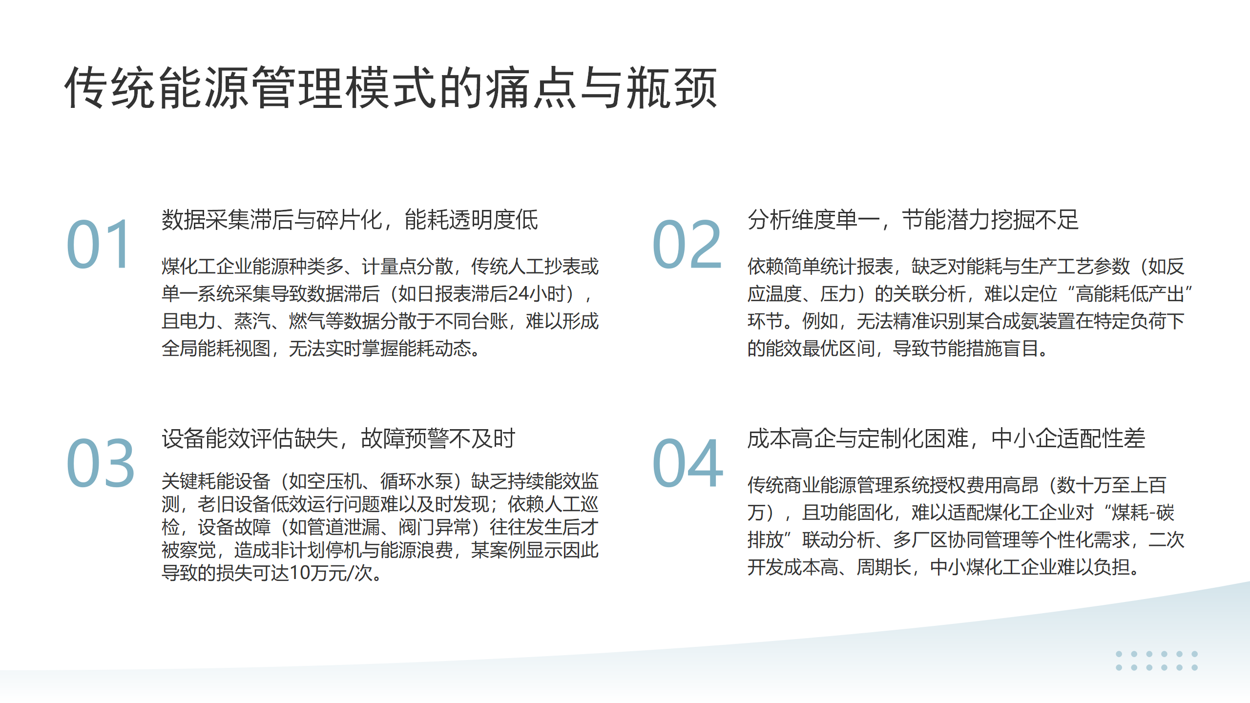 其四,成本高企与定制化困难,中小企适配性差。传统商业能源管理系统授权费用高昂,功能固化,难以适配煤化工企业个性化需求,二次开发成本高、周期长,中小煤化工企业难以负担。