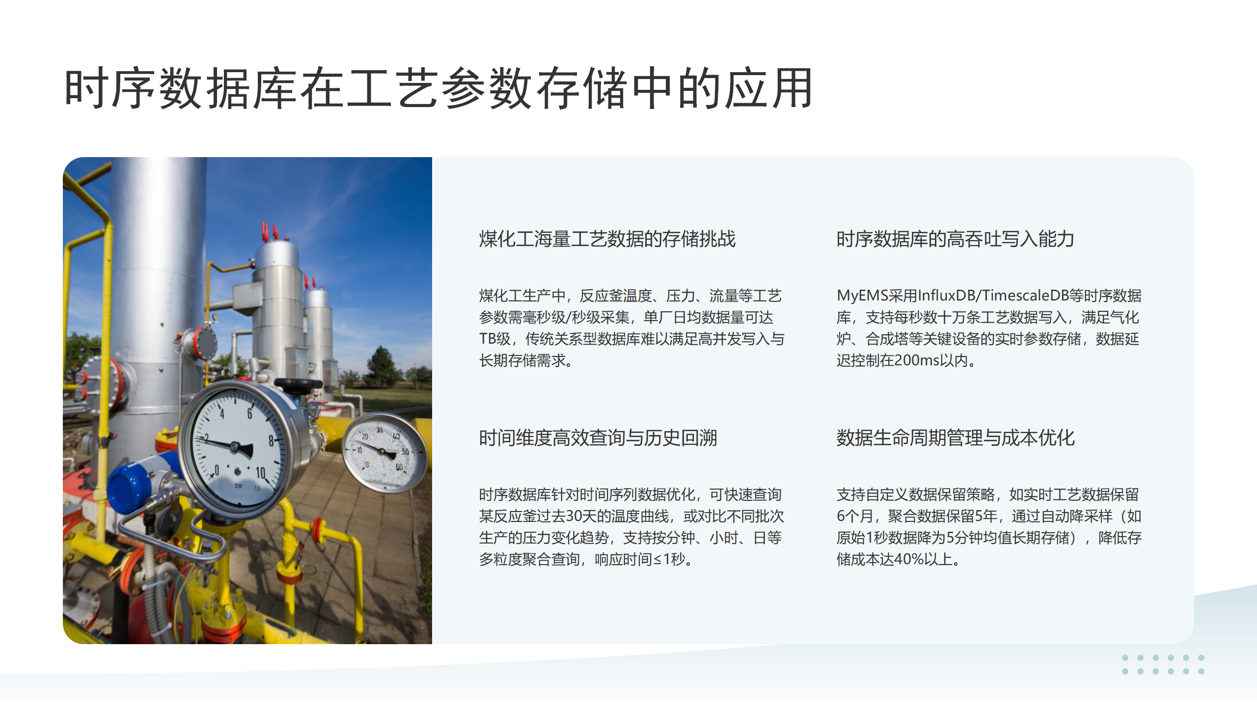 煤化工行业生产过程中,对反应釜温度、压力、流量等工艺参数的采集需达到毫秒级或秒级,单厂日均数据量巨大,可达TB级。传统关系型数据库难以应对如此高并发的写入需求,以及长期存储的挑战。