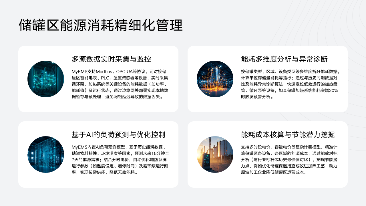 再者,MyEMS内置AI负荷预测模型,基于历史能耗数据、储罐物料特性、环境温度等因素,能预测未来15分钟至7天的能源需求。结合分时电价,系统可自动优化加热系统运行参数及循环泵运行频率,实现按需供能,降低无效能耗。