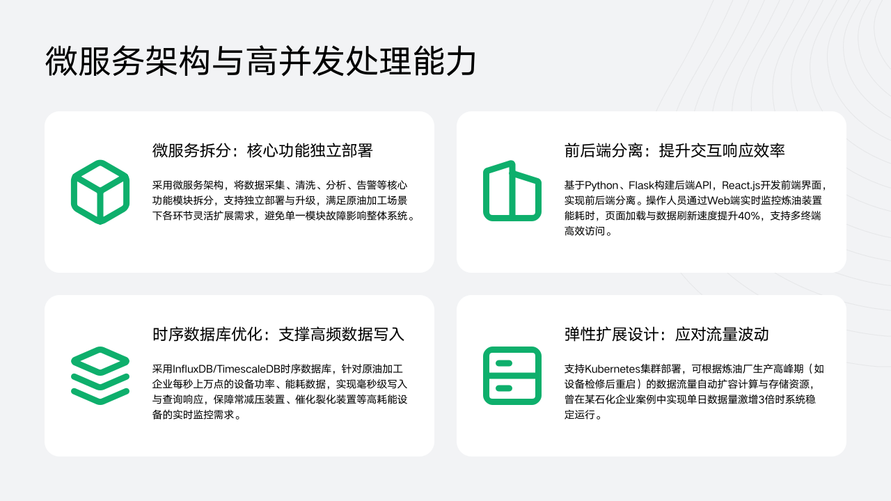前后端分离显著提升交互响应效率。基于Python、Flask构建后端API,React.js开发前端界面,操作人员通过Web端监控炼油装置能耗时,页面加载与数据刷新速度提升40%,支持多终端高效访问,极大提高了操作的便捷性和实时性。