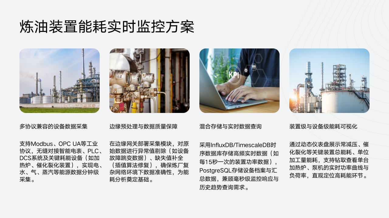 炼油装置能耗实时监控方案是保障炼油企业高效生产与节能降耗的关键。该方案具备多协议兼容的数据采集能力,支持Modbus、OPC UA等工业协议,能与智能电表、PLC、DCS系统及关键耗能设备无缝对接,实现能源数据分钟级采集,这为能耗分析提供了及时且全面的数据基础。