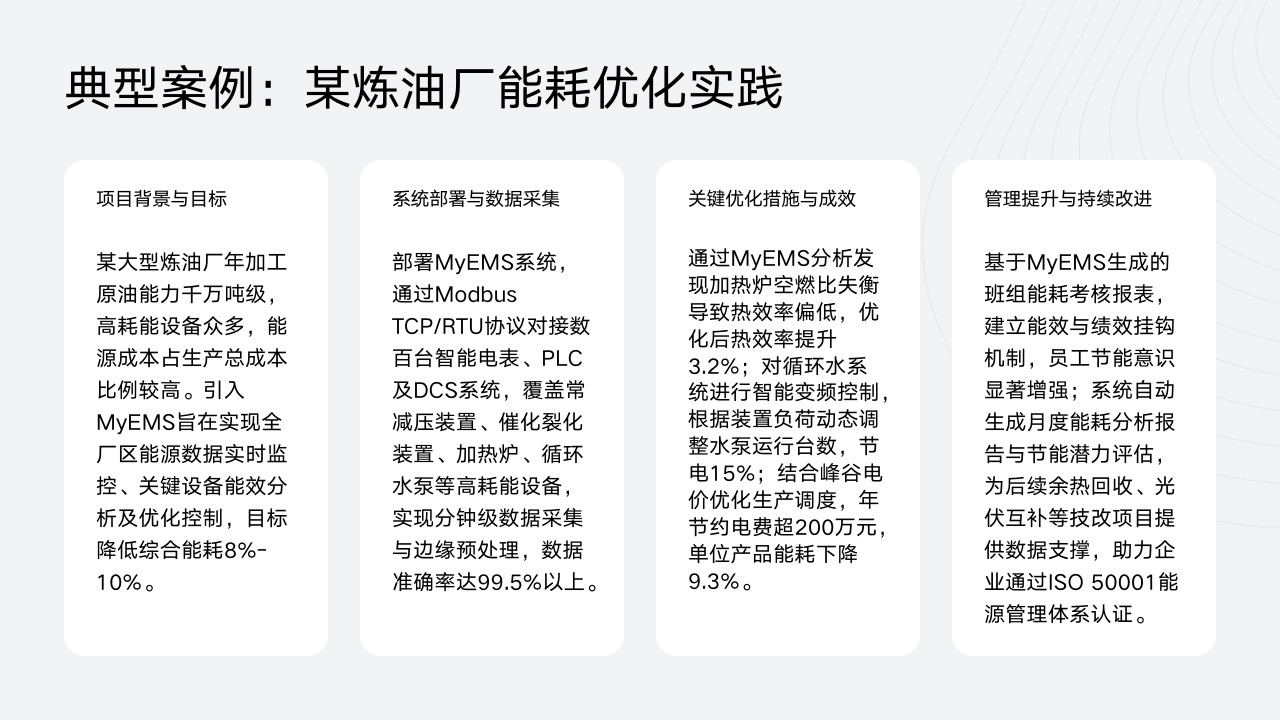 前面我们详细了解了石油化工行业不同场景下MyEMS系统的应用方案。接下来进入“实施效益与案例分析”环节,此部分能让我们直观看到MyEMS系统在实际应用中带来的节能成效、成本节约等效益。之后还会有典型案例展示,值得期待。