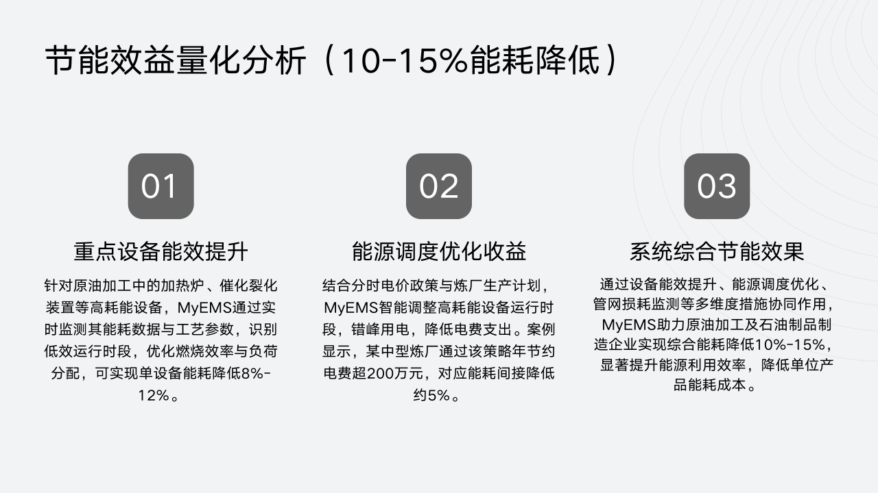 MyEMS在原油加工及石油制品制造企业的节能效益显著,可实现10%-15%的能耗降低,具体体现在以下三个方面。