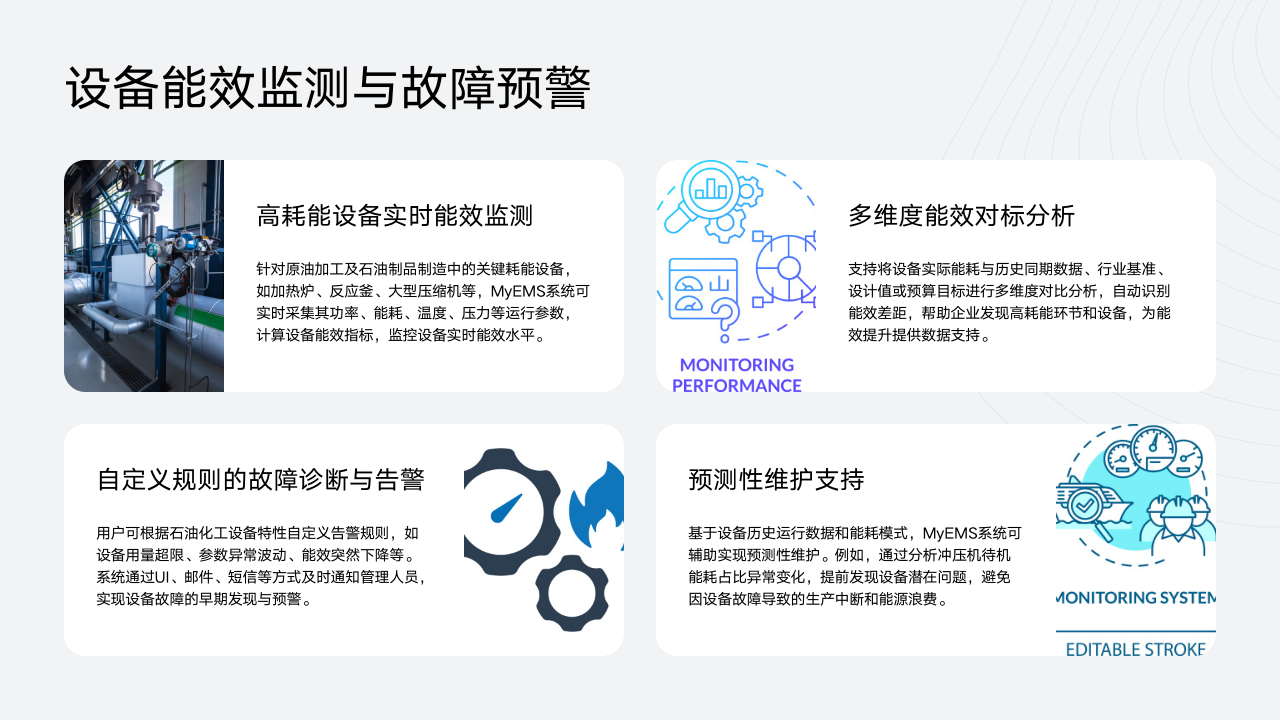 MyEMS系统在设备能效监测与故障预警方面功能卓越,可助力原油加工及石油制品制造企业提升设备管理水平。