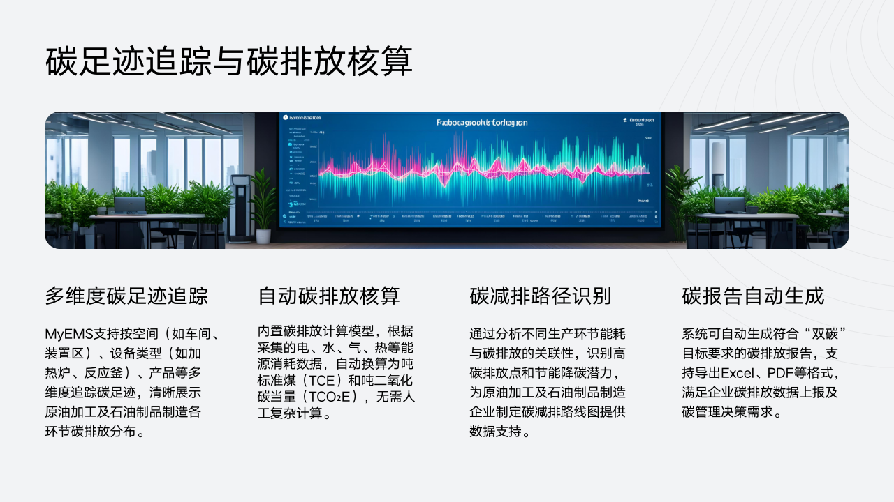 在“双碳”目标的大背景下,MyEMS系统内置碳排放计算模型,能根据能耗数据自动换算吨标准煤和吨二氧化碳当量,生成符合行业标准的碳足迹报告。这为原油加工企业提供了有效的碳排放管理工具,助力企业达成“双碳”目标。