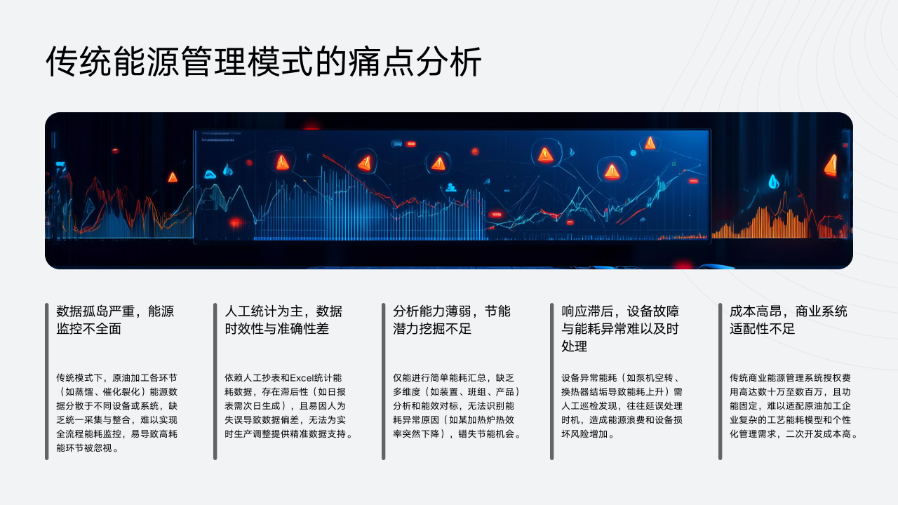 最后,传统商业能源管理系统成本高昂,且适配性不足。其授权费用高达数十万至数百万,功能固定,难以适配原油加工企业复杂的工艺能耗模型和个性化管理需求,二次开发成本也居高不下。这些痛点使得传统能源管理模式难以满足企业在能源管理和节能减排方面的需求,迫切需要进行变革。