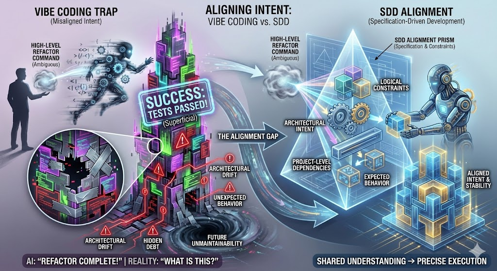 在Vibe Coding场景下,重构不是简单的"改代码",而是一个"对齐意图理解"的过程。当这个意图理解是项目级的意图,不只是依赖单个文件或模块目录的理解就够了,而是需要基于对项目架构,逻辑结构以及模块关联,来把具体的规划与重构意图进行对齐。要实现这个对齐,SDD(Specification-Driven Development)是一种很切合的方式,本文就基于SDD方法论扩展实践总结为一个用于代码重构场景的方法模型,来说明如何实现对齐重构意图。先做好规范,再开始开发,是现阶段vibe coding提升稳定性和可控性的一种有效方式。