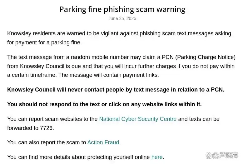 2025年6月,英国Knowsley地区爆发大规模“停车罚单钓鱼短信”事件,攻击者冒充地方政府发送包含支付链接的虚假PCN(Parking Charge Notice),诱导居民点击并输入银行卡信息。值得注意的是,Knowsley市政厅明确声明:“本机构绝不会通过短信方式发送停车罚单或要求在线支付。”这一声明揭示了攻击者对公共服务流程的精准模仿与对用户心理的深度操控——利用人们对行政处罚的天然畏惧,制造紧迫感以削弱理性判断。