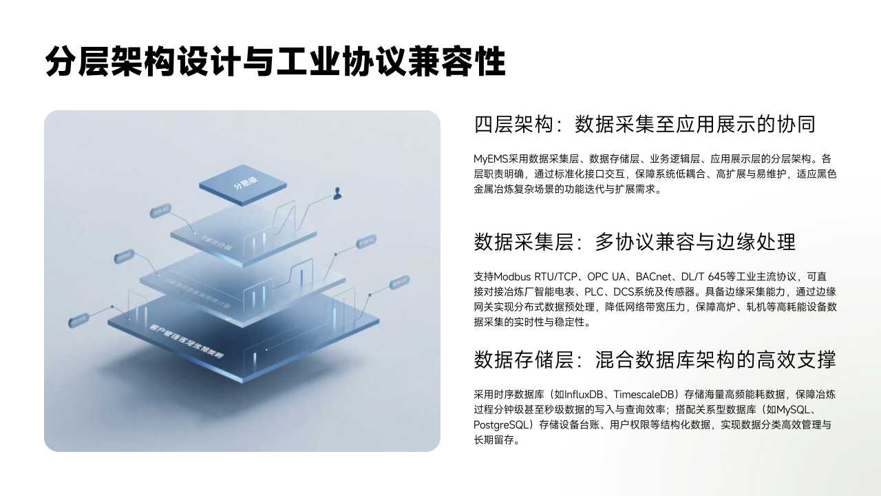 MyEMS采用分层架构设计,具备良好的工业协议兼容性,能有效适应黑色金属冶炼复杂场景。其四层架构实现了从数据采集至应用展示的协同。数据采集层、数据存储层、业务逻辑层和应用展示层职责明确,通过标准化接口交互,保障系统低耦合、高扩展与易维护,可满足复杂场景下的功能迭代与扩展需求。