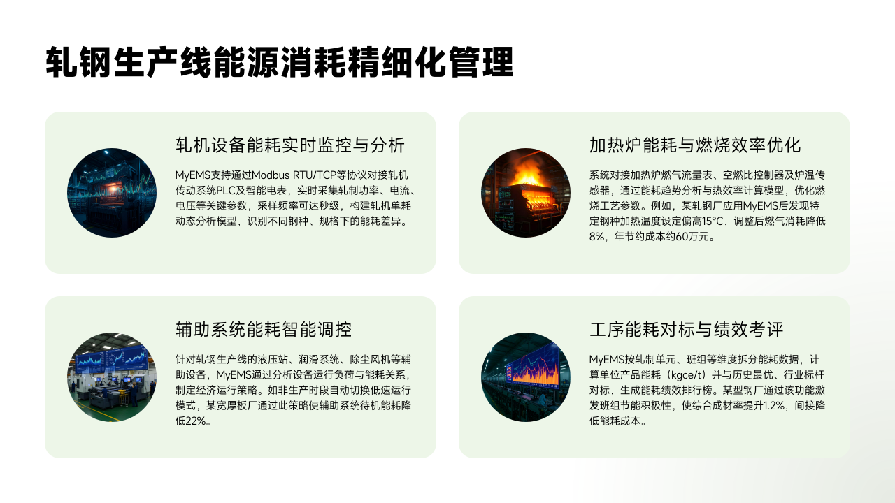 在轧机设备能耗管理方面,MyEMS通过Modbus RTU/TCP等协议,与轧机传动系统PLC及智能电表对接,实现对轧制功率、电流、电压等关键参数的秒级采样。基于这些数据构建的轧机单耗动态分析模型,能够精准识别不同钢种和规格下的能耗差异,为企业优化生产提供数据支撑。
