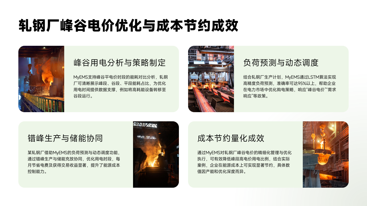 最后,通过MyEMS对轧钢厂峰谷电价的精细化管理与优化执行,能够有效降低峰段高电价用电比例。从实际案例来看,企业在能源成本上可实现显著节约,不过具体的节约数值会因产能和优化深度的不同而有所差异。总体而言,MyEMS为轧钢厂在能源成本控制方面提供了强大的支持。