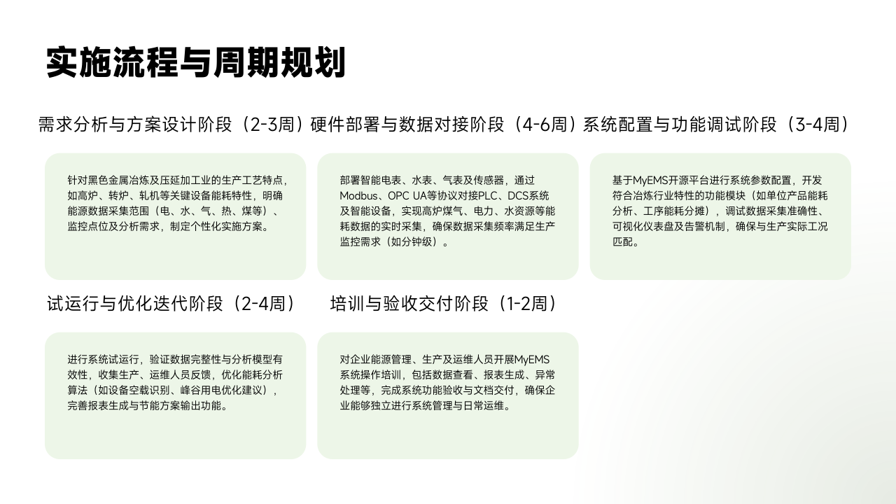 试运行与优化迭代阶段为2 - 4周,通过系统试运行,验证数据完整性与分析模型有效性,收集生产、运维人员反馈,优化能耗分析算法,完善报表生成与节能方案输出功能,不断提升系统性能。