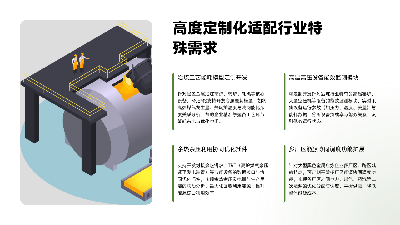 成本高昂且功能固化,难以适配行业特性。传统闭源能源管理系统软件授权费、实施服务费及后续升级费用高昂,功能模块固定,无法满足黑色金属冶炼行业对高炉煤气回收、余热余压利用等个性化场景的深度管理需求。