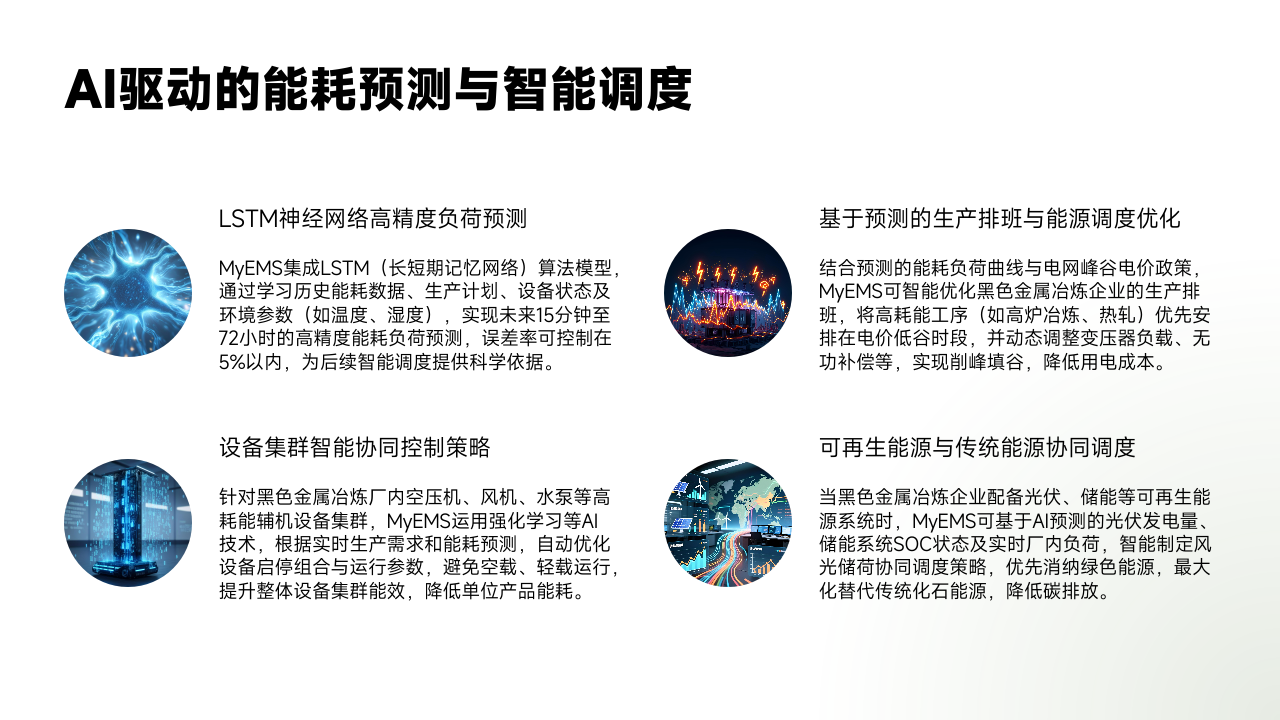 MyEMS借助AI实现能耗预测与智能调度,为黑色金属冶炼企业带来显著效益。首先是LSTM神经网络高精度负荷预测,MyEMS集成LSTM算法模型,通过学习历史能耗数据、生产计划、设备状态及环境参数,能实现未来15分钟至72小时的高精度能耗负荷预测,误差率控制在5%以内。这为后续智能调度提供了科学依据,使企业能提前做好能源规划。