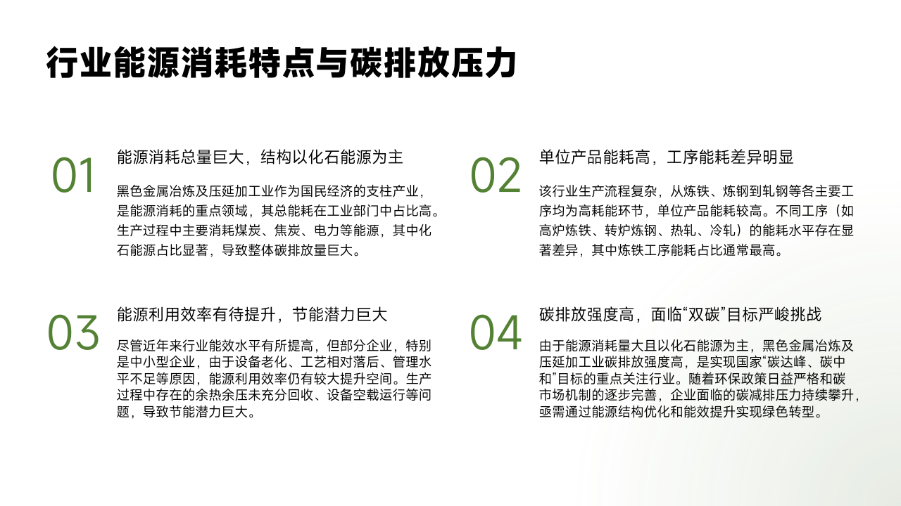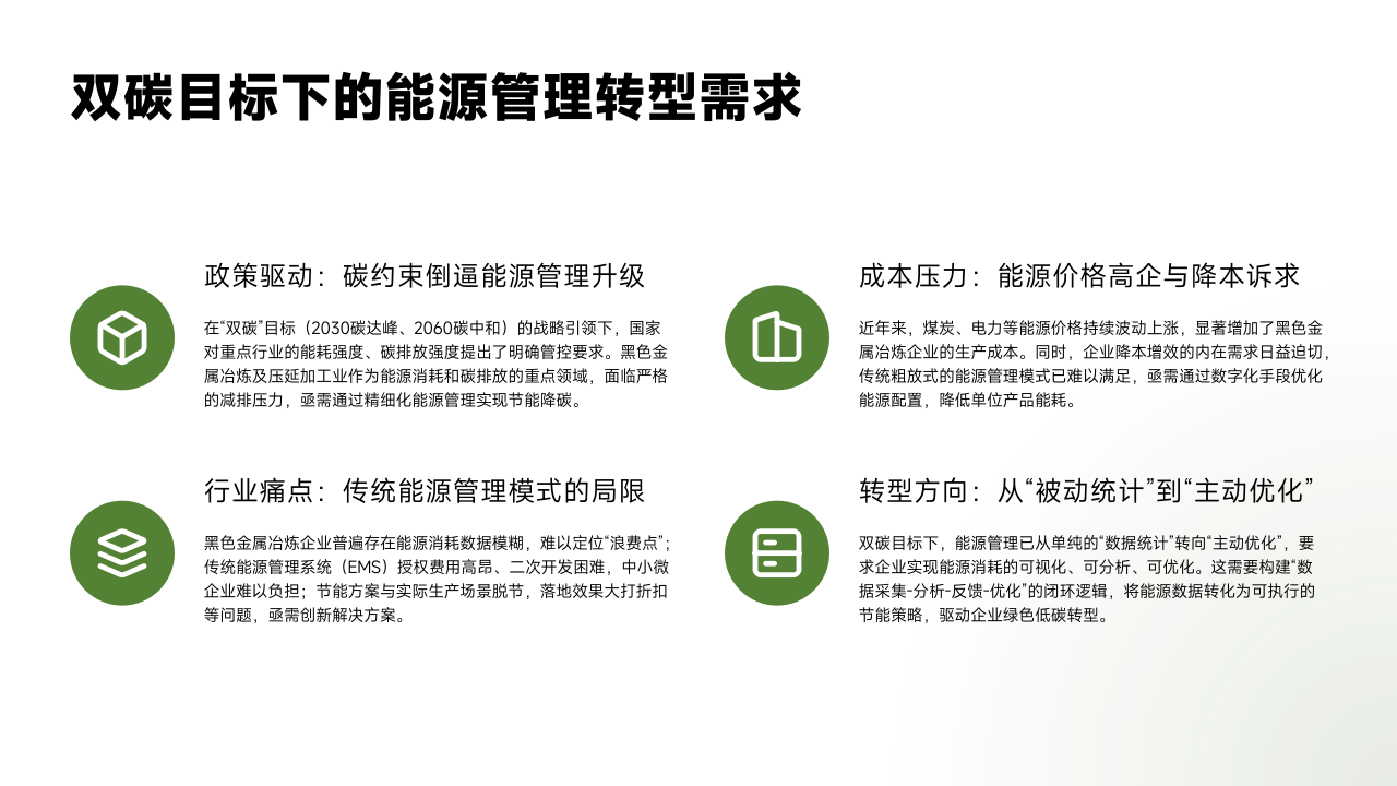 在“双碳”目标的战略引领下,黑色金属冶炼及压延加工业的能源管理转型需求日益迫切,主要体现在政策、成本、行业痛点和转型方向四个方面。