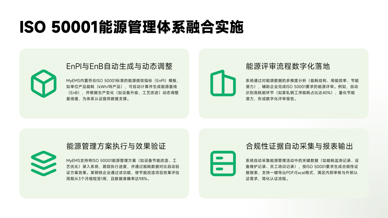 综上所述,MyEMS通过一系列功能,实现了与ISO 50001能源管理体系的深度融合,为企业的能源管理和认证提供了全方位的支持。