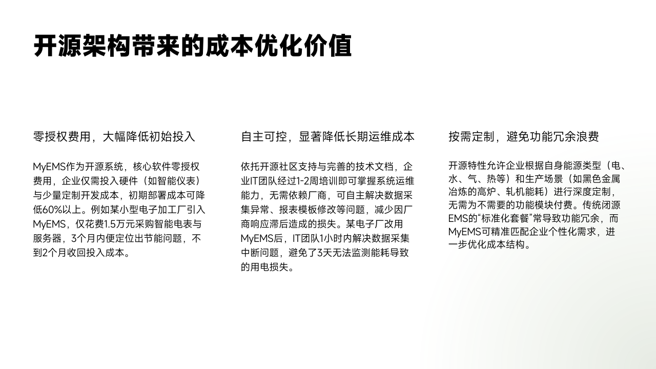 自主可控的特性可显著降低长期运维成本。依托开源社区支持与完善的技术文档,企业IT团队经过1 - 2周培训即可掌握系统运维能力,无需依赖厂商,能自主解决数据采集异常、报表模板修改等问题,减少因厂商响应滞后造成的损失。如某电子厂改用MyEMS后,IT团队1小时内解决数据采集中断问题,避免了3天无法监测能耗导致的用电损失。