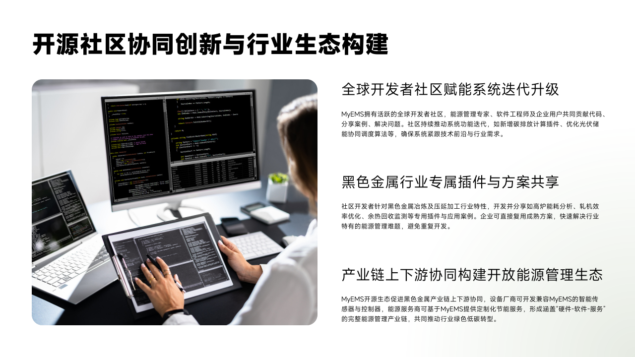 MyEMS开源生态促进了黑色金属产业链上下游协同。设备厂商可开发兼容MyEMS的智能传感器与控制器,能源服务商可基于MyEMS提供定制化节能服务,形成涵盖“硬件 - 软件 - 服务”的完整能源管理产业链。这种协同模式共同推动行业绿色低碳转型,为行业的可持续发展奠定了坚实基础。