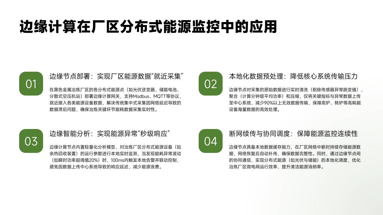 然后是边缘智能分析,边缘计算节点内置轻量化分析模型,对冶炼厂区分布式能源设备的运行参数进行本地实时监测。当发现能耗异常波动,如瞬时功率超阈值20%时,能在100ms内触发本地告警并联动控制,避免因数据上传中心系统导致的响应延迟,减少能源浪费。