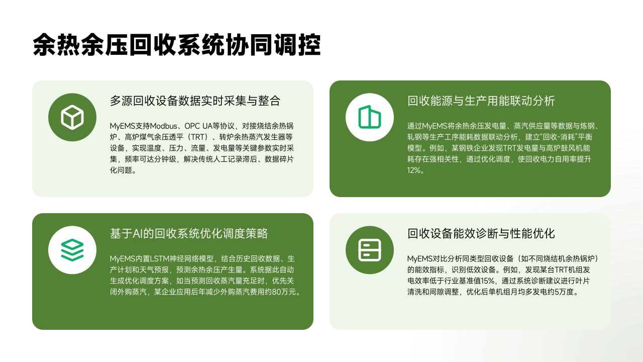 余热余压回收系统协同调控是提升能源利用效率的关键环节。首先,MyEMS具备多源回收设备数据实时采集与整合能力,通过支持Modbus、OPC UA等协议,能对接烧结余热锅炉、高炉煤气余压透平、转炉余热蒸汽发生器等设备,以分钟级频率采集温度、压力、流量、发电量等关键参数,从根本上解决传统人工记录滞后、数据碎片化问题,为后续分析提供准确数据支撑。
