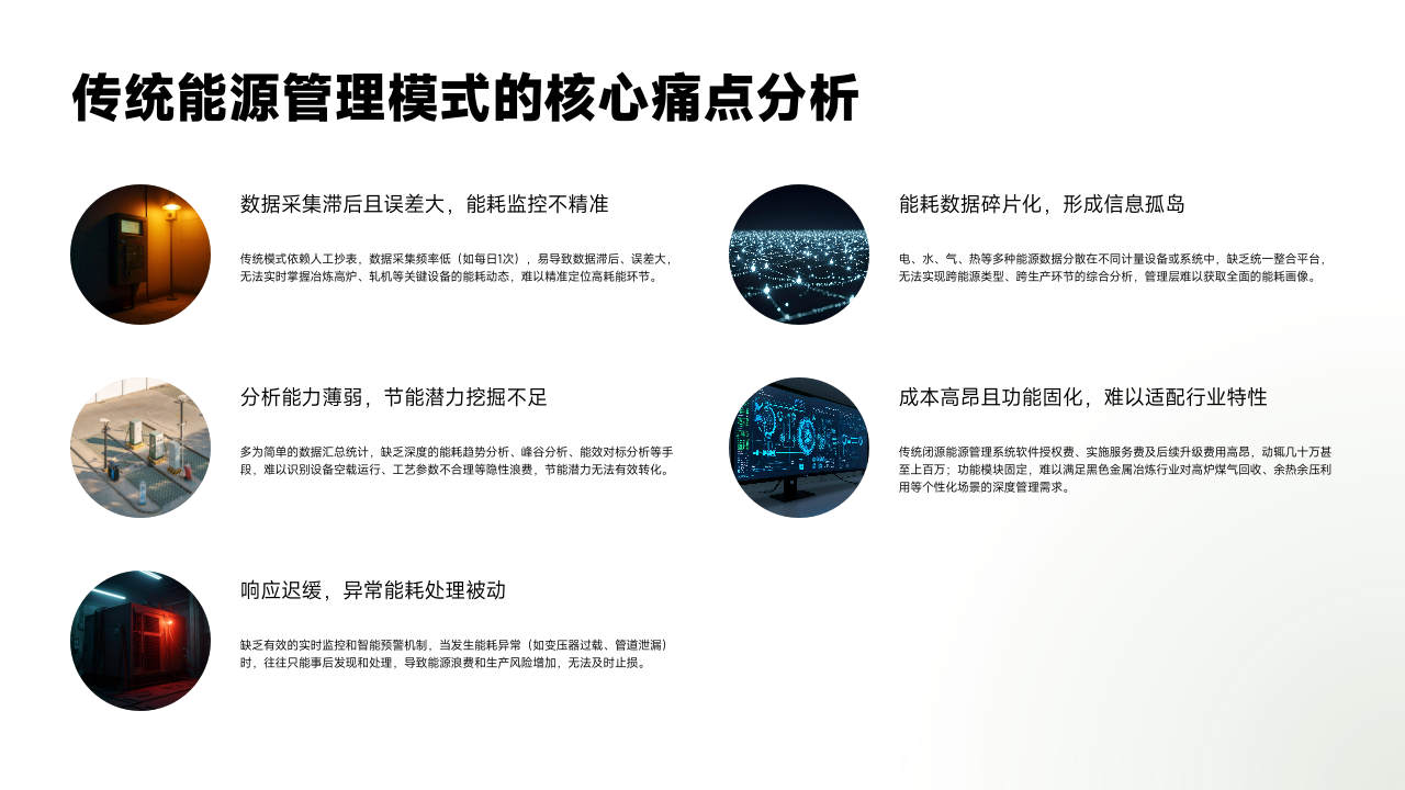 传统能源管理模式存在诸多核心痛点,严重制约了黑色金属冶炼及压延加工业的能源管理效率与绿色转型。