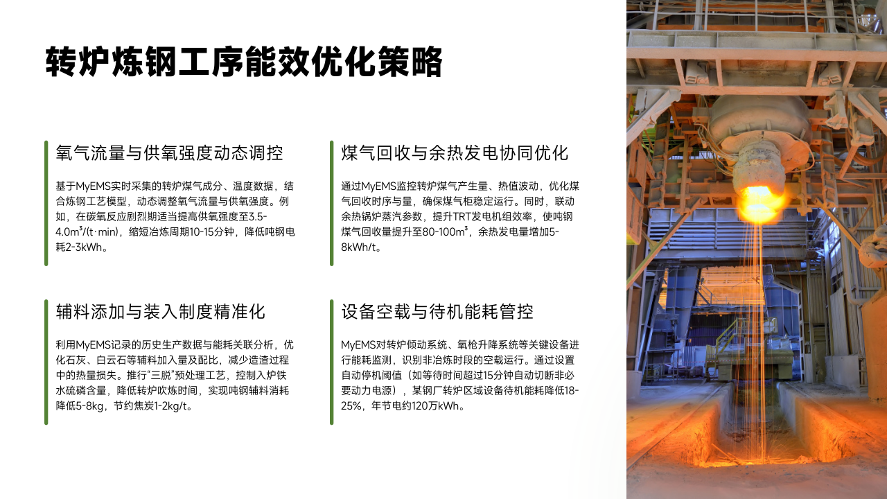 在转炉炼钢工序中,MyEMS提供了一系列能效优化策略。其一,是氧气流量与供氧强度动态调控。基于MyEMS实时采集的转炉煤气成分和温度数据,结合炼钢工艺模型,可动态调整氧气流量与供氧强度。在碳氧反应剧烈期适当提高供氧强度,能缩短冶炼周期,降低吨钢电耗,实现高效节能。