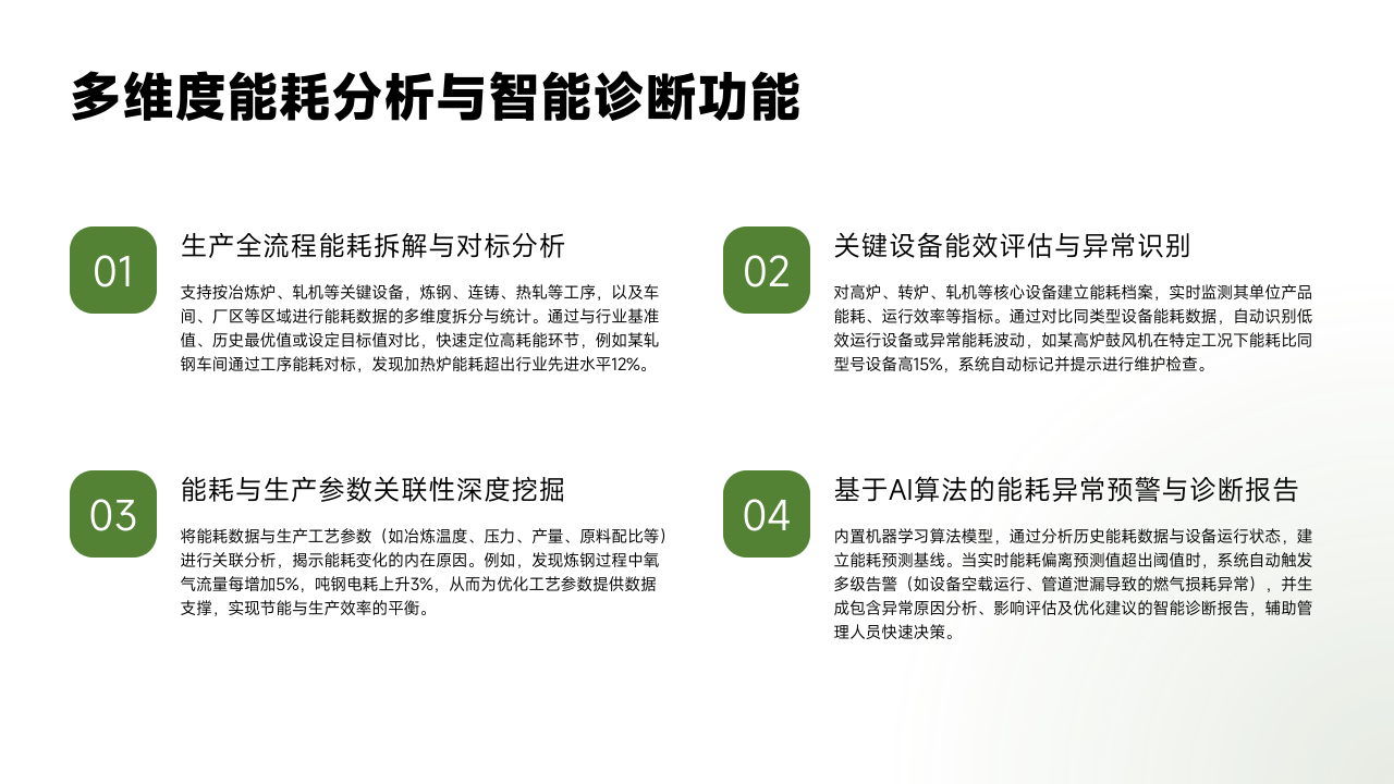 设备级能耗追踪按工序拆分能耗,追踪单台设备的实时功率与累计能耗,能自动识别“高能耗设备”。某钢厂通过该功能发现2#高炉TRT机组发电量低,排查后解决问题使能耗降低,体现了其在定位和解决高耗能设备问题上的有效性。