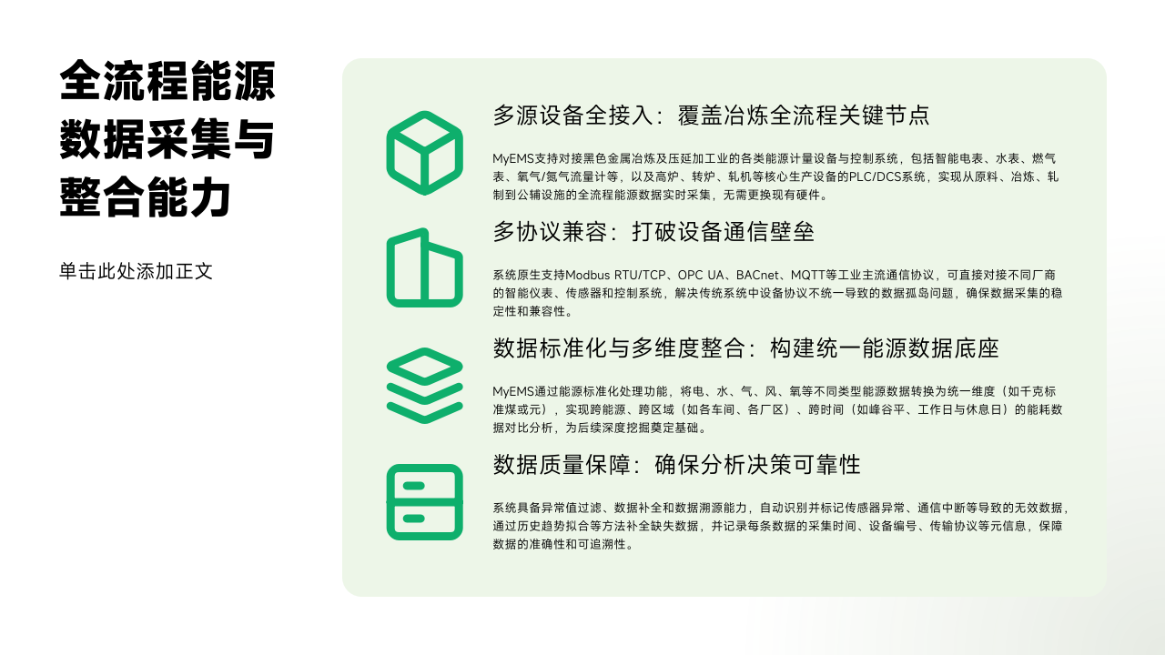 前面我们详细了解了MyEMS在冶炼各环节的解决方案及余热余压回收系统调控。现在,让我们将目光转向系统的技术支撑层面。第18页将开启系统技术架构与部署实施的内容,这有助于我们深入理解系统如何搭建与落地,后续还会有具体架构和实施流程的介绍。
