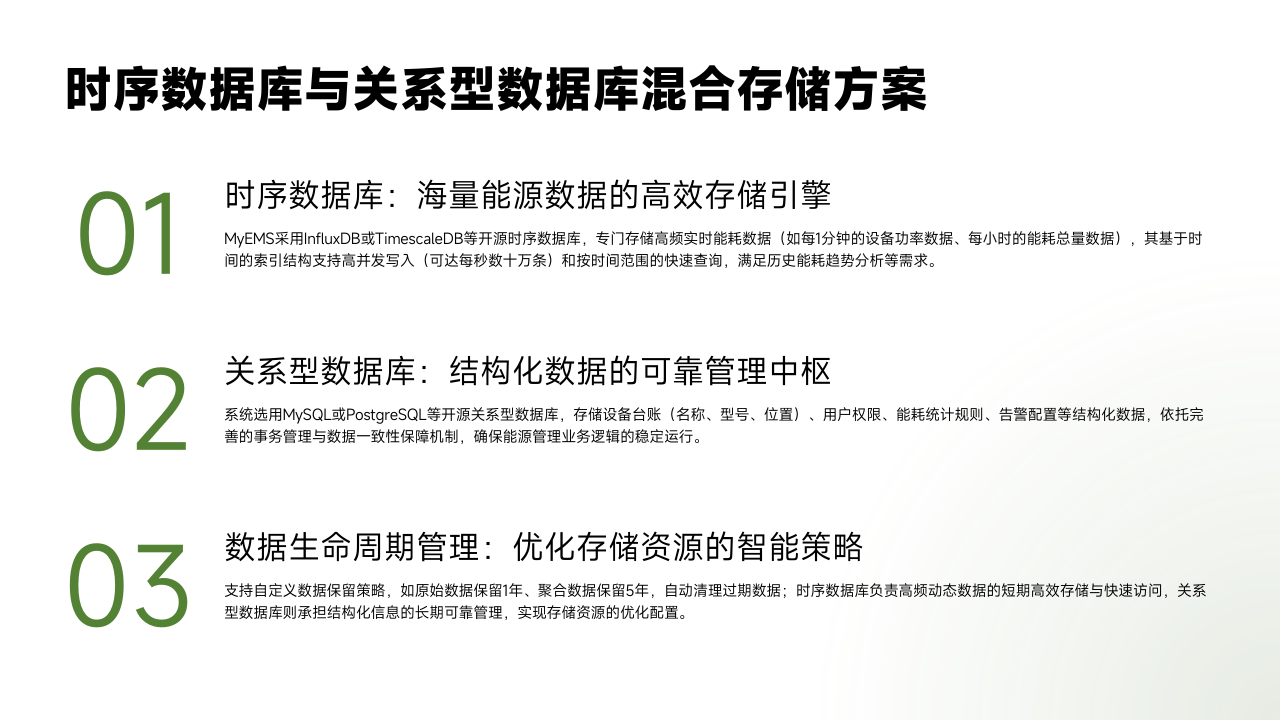 数据生命周期管理是优化存储资源的智能策略,MyEMS支持自定义数据保留策略,如原始数据保留1年、聚合数据保留5年,并自动清理过期数据。时序数据库负责高频动态数据的短期高效存储与快速访问,关系型数据库承担结构化信息的长期可靠管理,实现了存储资源的优化配置。这种混合存储方案,既满足了能源数据存储的高效性和实时性,又保障了结构化数据管理的稳定性和可靠性。