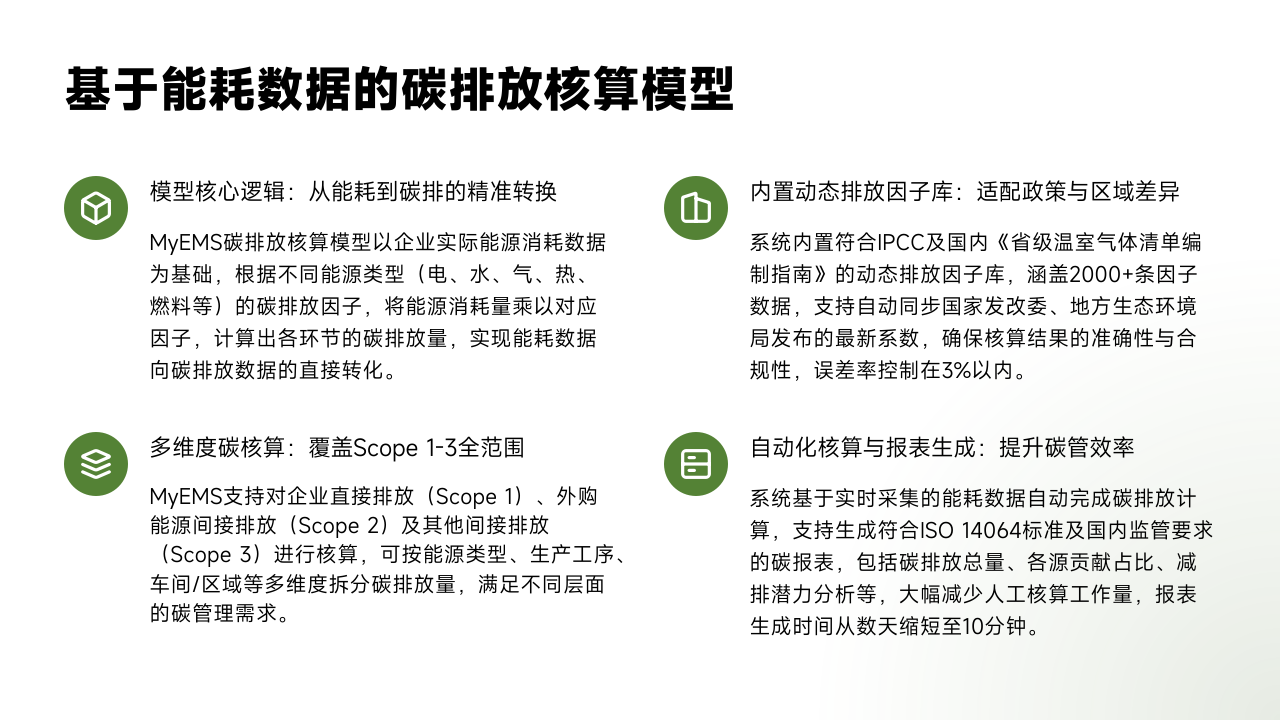 在核算范围上,MyEMS支持对企业直接排放(Scope 1)、外购能源间接排放(Scope 2)及其他间接排放(Scope 3)进行核算,并能按能源类型、生产工序、车间/区域等多维度拆分碳排放量,满足不同层面的碳管理需求。