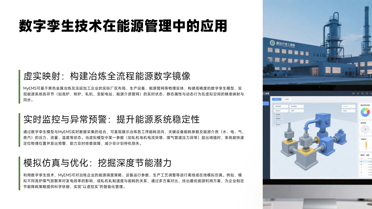 数字孪生技术在能源管理领域具有重要应用价值,MyEMS在黑色金属冶炼及压延加工企业中充分发挥了该技术的优势。